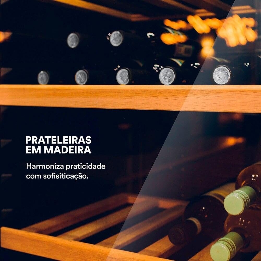 A refrigeração por compressor com gás ecológico assegura uma temperatura interna precisa, enquanto a porta de vidro Double Glass não apenas proporciona uma visão clara de suas garrafas, mas também contribui para a eficiência energética. As prateleiras de madeira foram cuidadosamente projetadas para acomodar garrafas de vinho de forma segura, adicionando um toque de elegância à sua adega.