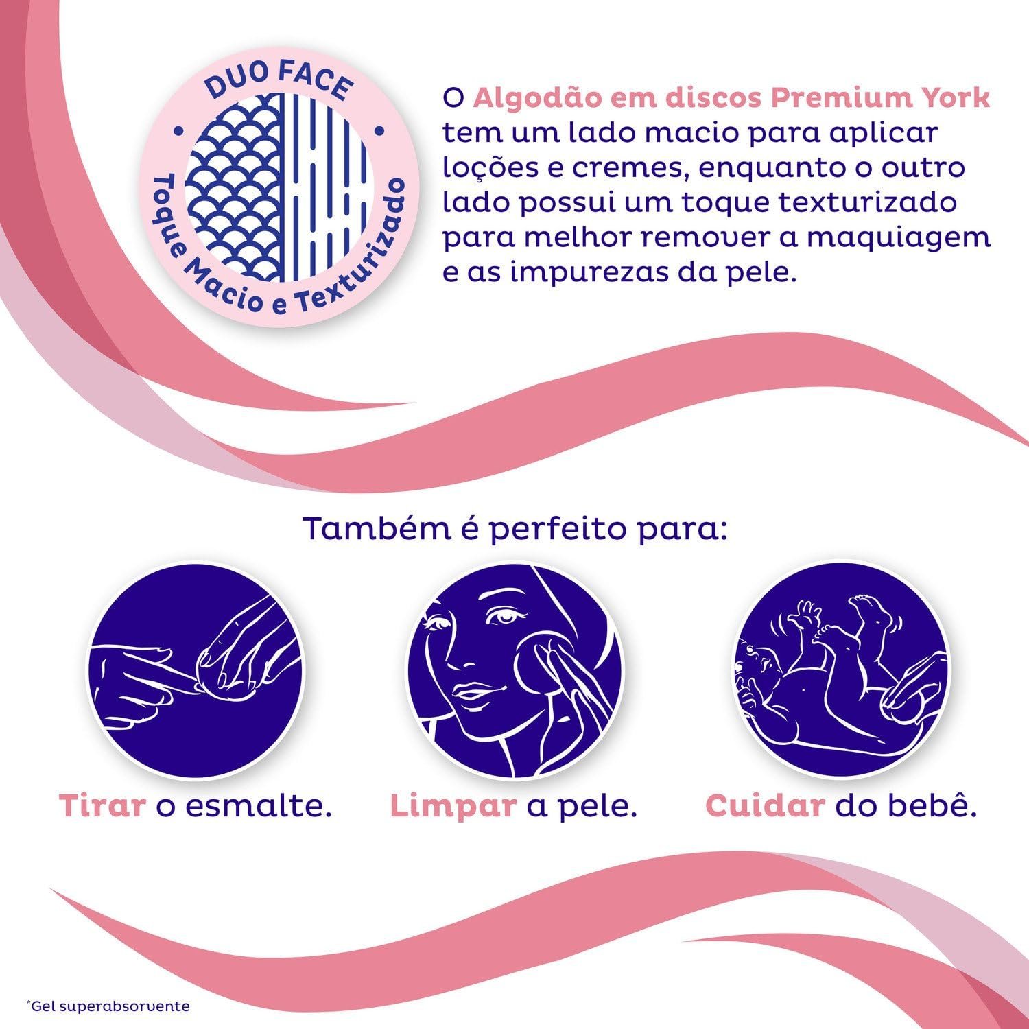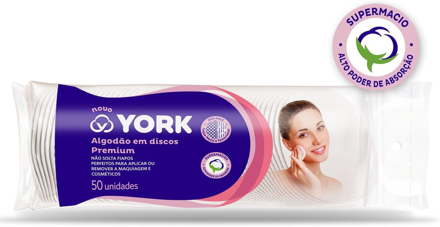 Supermacio e com alto poder de absorção, o algodão em discos york é perfeito para o cuidado pessoal. Tecnologia duo face. Face super macia que absorve melhor os líquidos, sendo indicada para aplicação de loções, cremes e maquiagem. Face ideal para remoção de maquiagem e limpeza de pele.