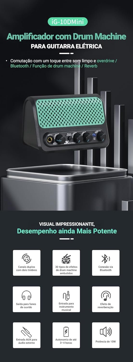 Amplificador Guitarra Portátil iG-10DMini com Bateria Eletrônica 30 Ritmos Bluetooth 10W Alto-Falante Duplo Recarregável USB-C Modos Clean/Overdrive e Entradas AUX/Fone para Prática em Casa/Viagem