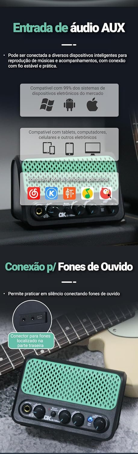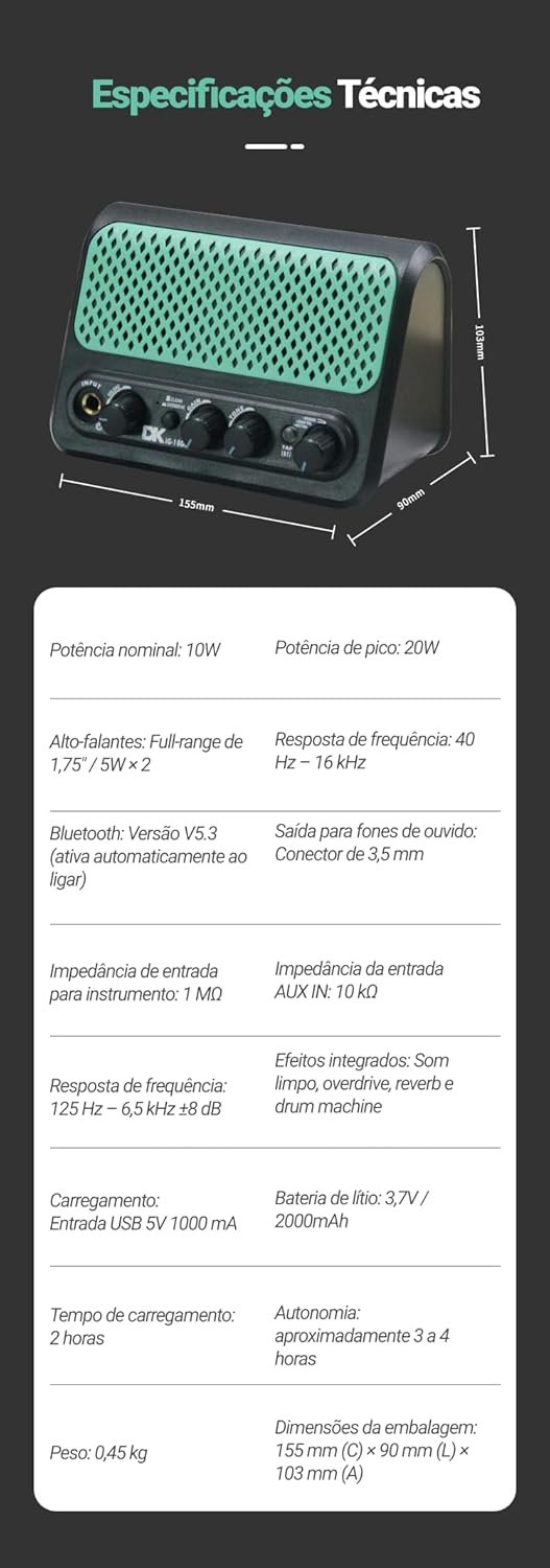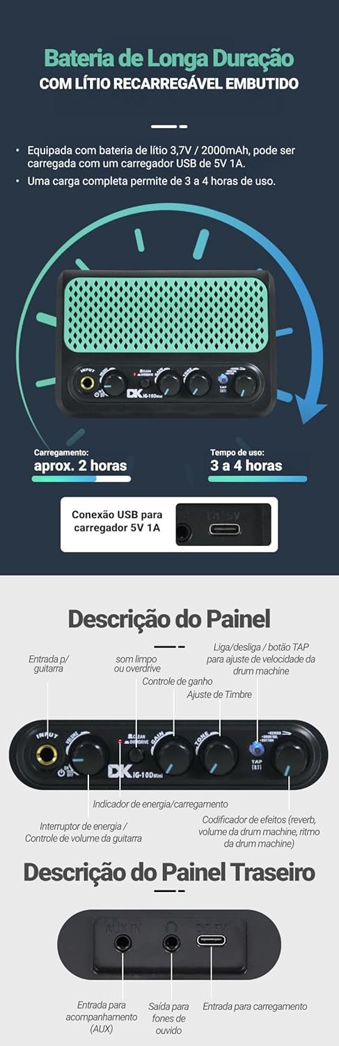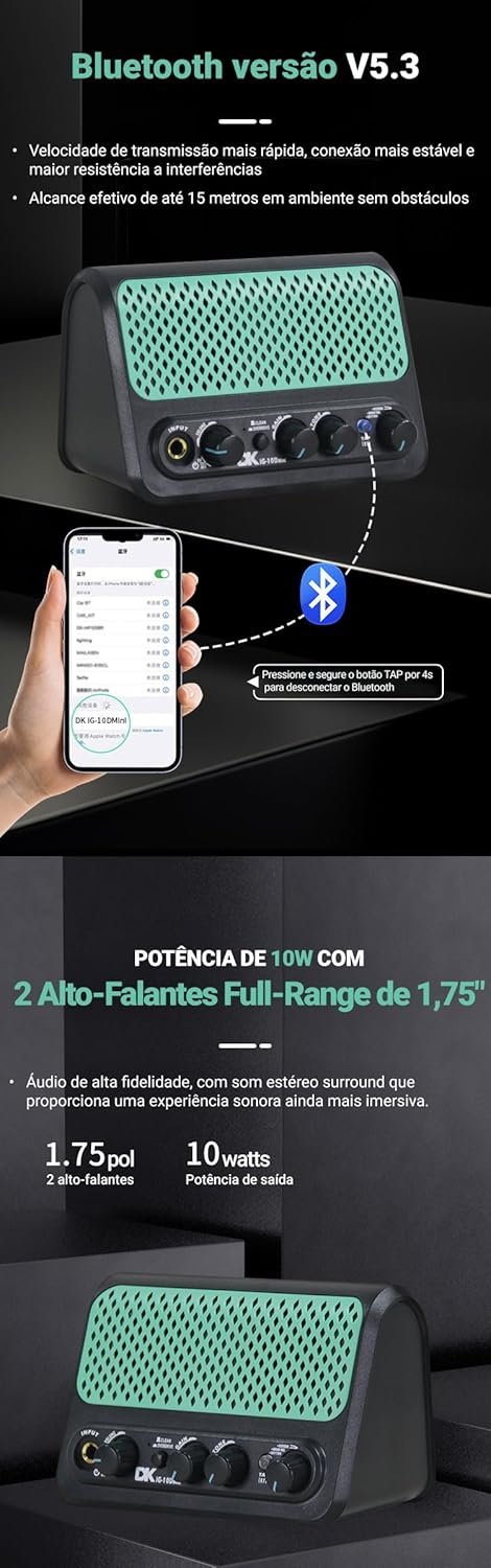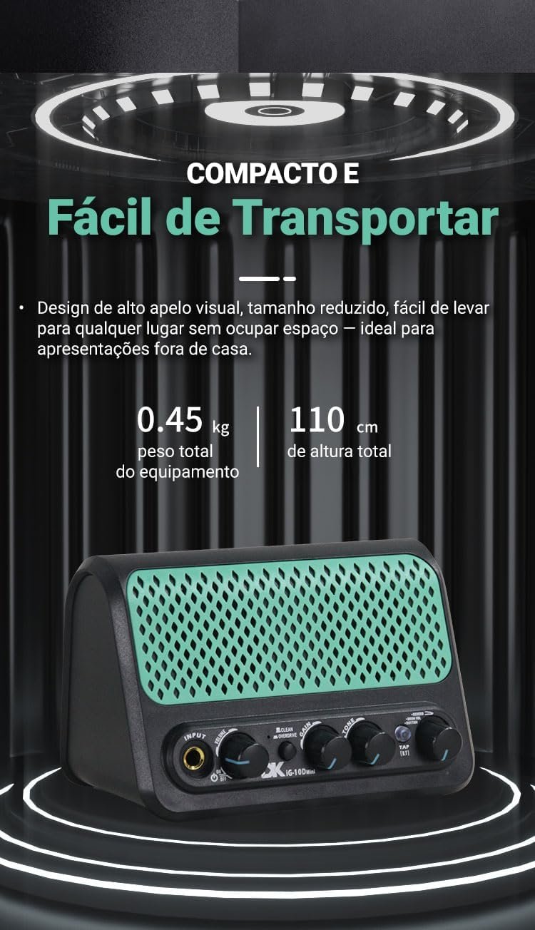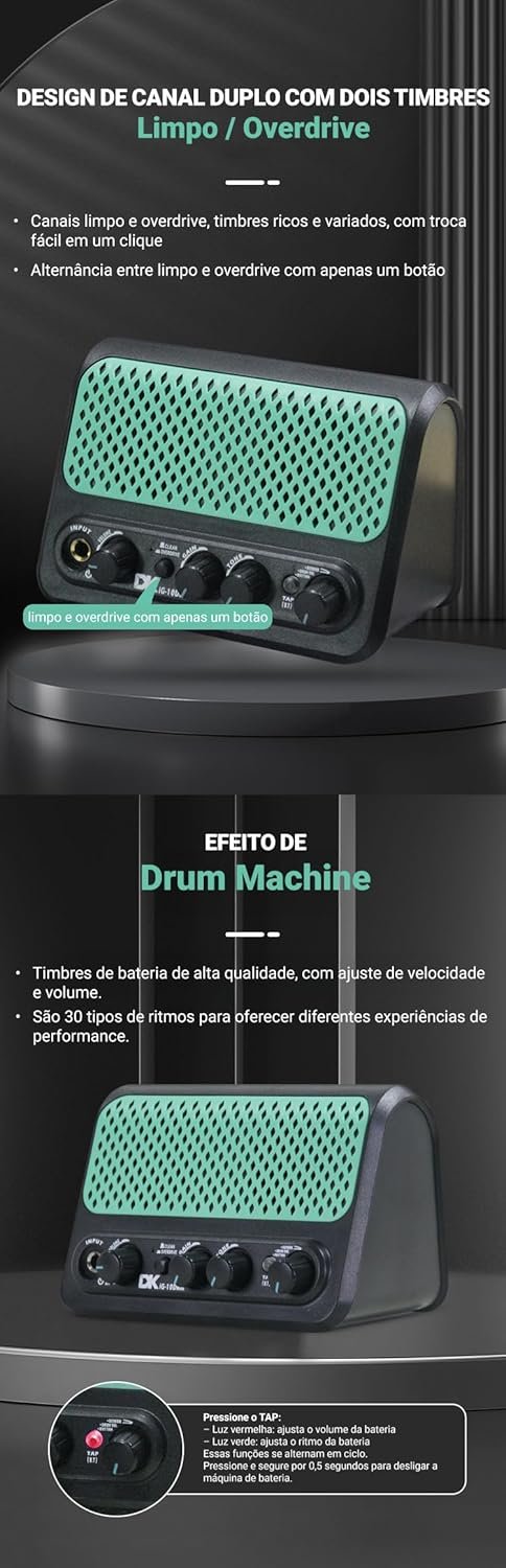 Transforme qualquer espaço em seu palco pessoal com o amplificador iG-10DMini! Projetado para guitarristas brasileiros que valorizam portabilidade e versatilidade, este equipamento combina 10W de potência estéreo com 30 padrões rítmicos profissionais – de batidas de rock pesado a grooves de samba envolventes. Controle total em suas mãos: a chave física alterna instantaneamente entre tons Clean prístinos para MPB e Overdrive quente para solos de rock, enquanto os botores de ganho e tom permitem ajustes precisos. O botão inteligente da bateria eletrônica oferece três funções (liga/desliga, modo TAP tempo para sincronização intuitiva e reset Bluetooth) e o codificador com LEDs ajusta reverberação espacial ou volume/ritmos da bateria. Conectividade completa para a era digital: transmita backing tracks via Bluetooth de apps como Spotify, conecte celulares/PCs via entrada AUX 3.5mm (volume independente) e pratique em silêncio com fones de ouvido – o alto-falante desliga automaticamente. A bateria de lítio 2000mAh dura 6 horas e recarrega em 3h via USB-C (cabo incluso), permitindo ensaios em praias, ônibus ou praças públicas sem tomadas. Perfeito para iniciantes em escolas de música, crianças aprendendo guitarra, músicos de rua ou sessões acústicas em bares. Construção robusta resistente a transporte, indicadores LED claros e manual em português garantem facilidade de uso. Seu parceiro musical essencial para criar, praticar e se apresentar em qualquer lugar do Brasil!