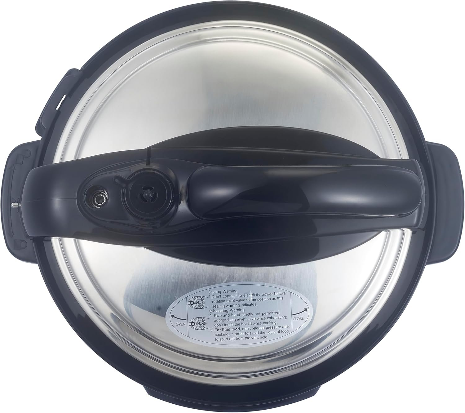Panela de pressão elétrica com 5L de capacidade, display digital , 900W de potência, revestimento antiaderente, programável com até 24 horas de antecedência, sistema de proteção para extrema pressão e temperatura