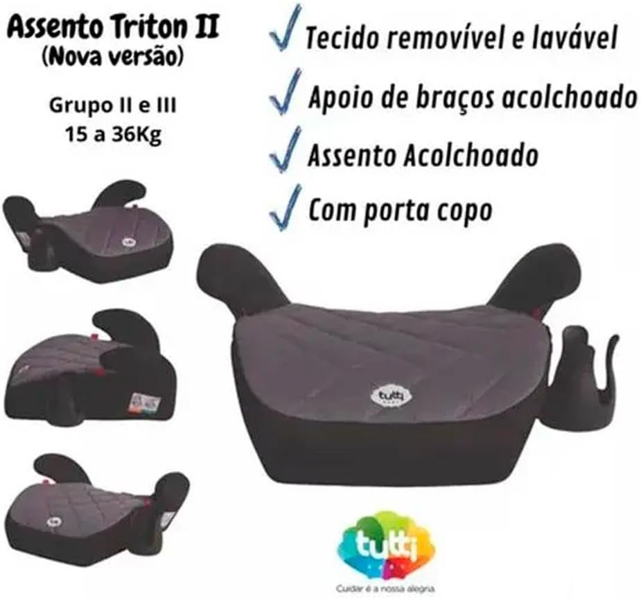 A Tutti Baby desenvolveu o Assento Triton para crianças com mais de 15kg e que não precisam mais do encosto para acomodar o cinto de segurança. A instalação é muito rápida e utiliza o cinto do automóvel. Para garantir o conforto da criança o produto tem tecido acolchoado e apoio lateral para os bracinhos. O Assento Triton segue a Norma NBR 14400.