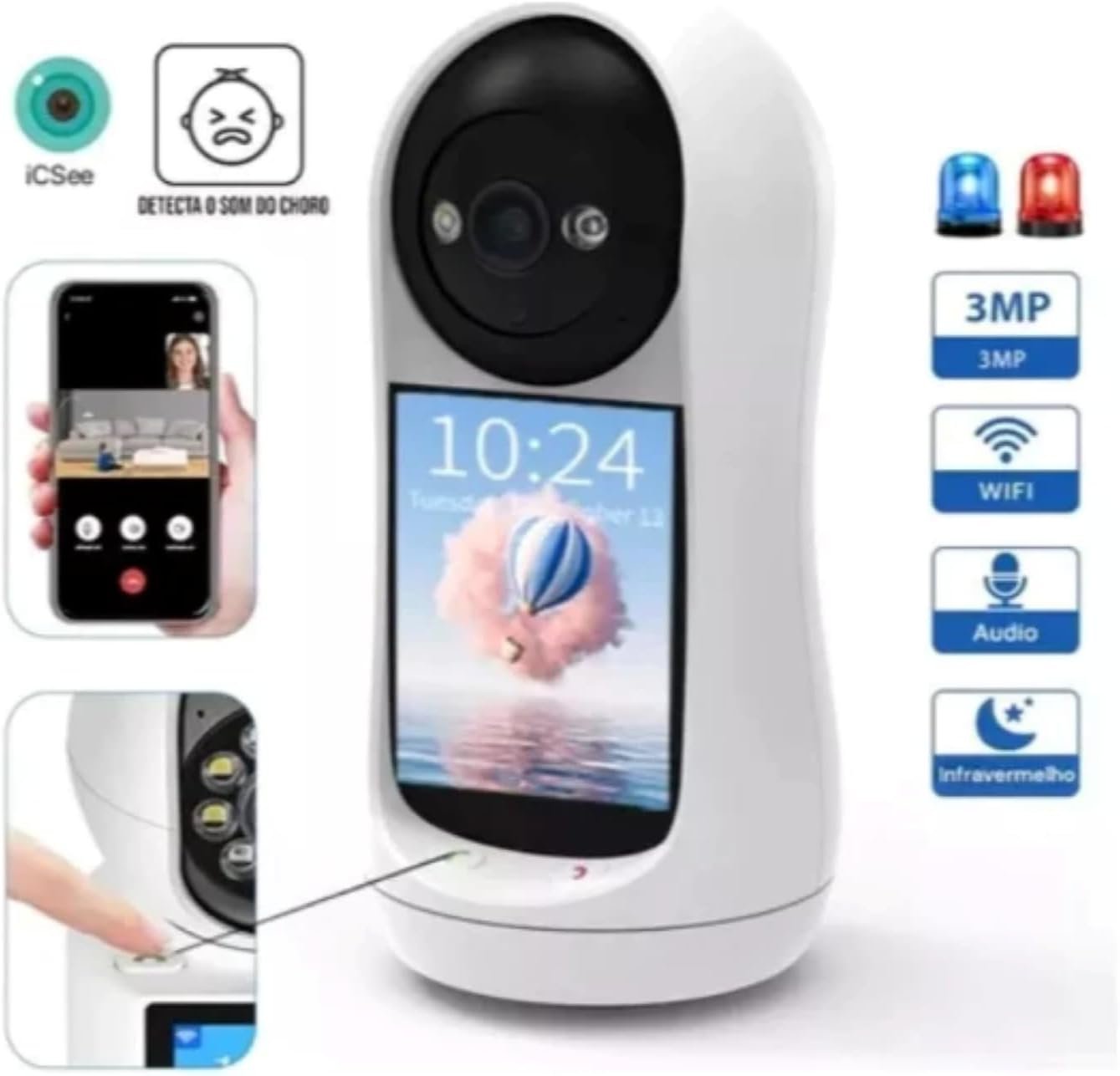 Babá Eletronica Câmera Inteligente com Vídeo Chamada e Detecção de Choro 3MP/4MP Wi-Fi Visão Noturna Alarme e Áudio Bidirecional Com Carregamento por USB Câmera de Segurança com Vídeo Chamada e Detecção de Choro para Bebês, Idosos e Pets – 3MP/4MP, Wi-Fi, Visão Noturna, Armazenamento SD/Nuvem, Controle Remoto, Alarme e Áudio Bidirecional. Esta câmera inteligente oferece monitoramento completo para sua casa com alta definição de 3MP ou 4MP, visão noturna e detecção de movimento e choro, ideal para bebês, idosos e pets. Com suporte para vídeo chamadas bidirecionais e áudio claro, você pode interagir remotamente a qualquer hora. A tecnologia de controle remoto PTZ permite ajustes de ângulo horizontal (355°) e vertical (90°). Armazenamento flexível em cartão SD até 128GB e na nuvem. Compatível com Wi-Fi 2.4GHz, não requer chip, e garante segurança e praticidade. Acesso remoto e múltiplos usuários garantem monitoramento contínuo e eficaz.