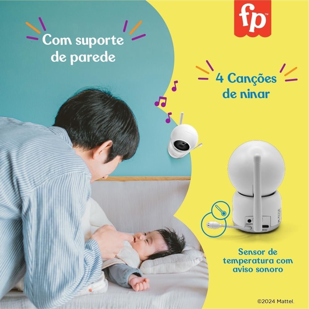 A Miss Nanny também conta com sensor de temperatura, alarme, 4 canções de ninar e áudio bidirecional, permitindo ouvir e falar com seu bebê. A luz infravermelha garante visão noturna, e o zoom de até 2x permite verificar detalhes com facilidade. Com suporte para parede ou móvel, a câmera possui campo de visão de 350° horizontal e 90° vertical, ajustável manualmente.