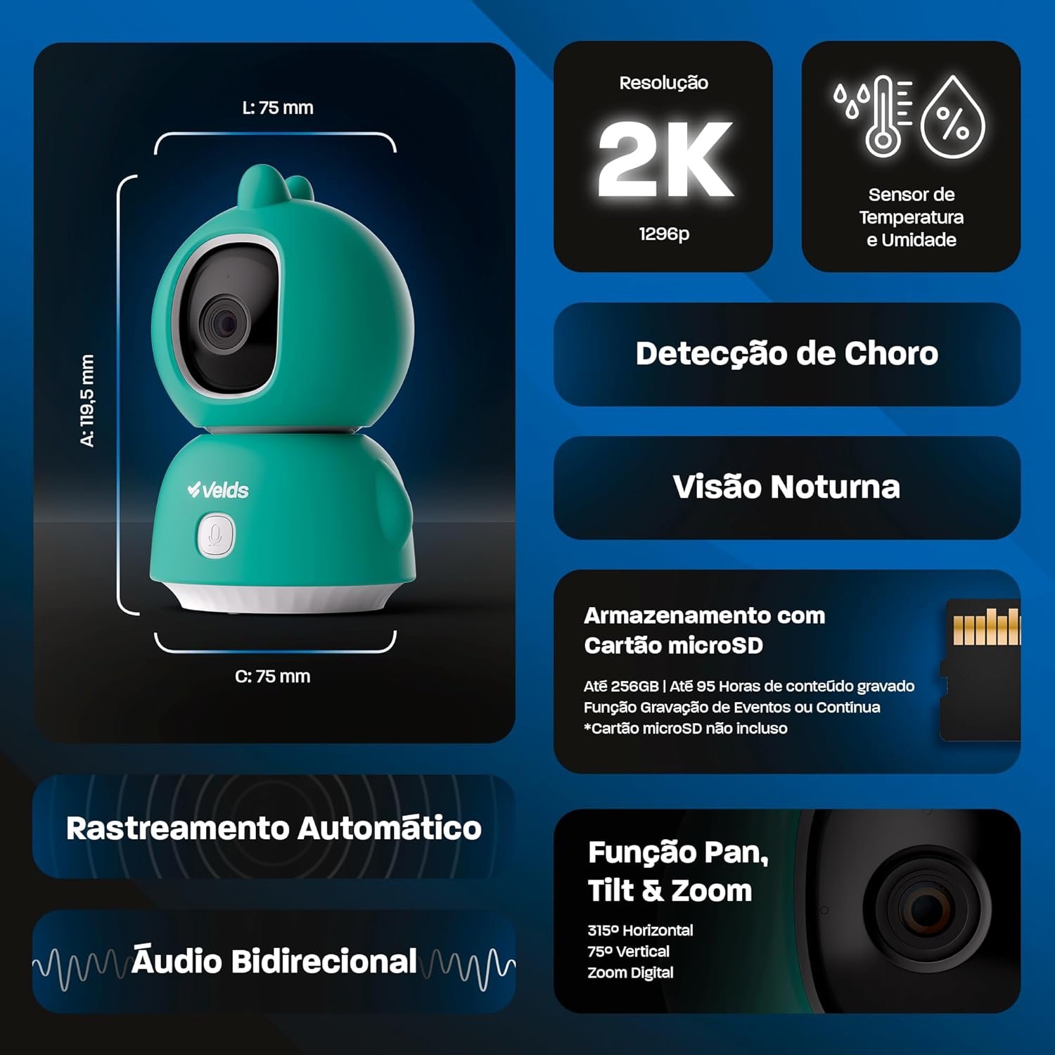 Monitoramento Completo no Celular: Acompanhe seu bebê em tempo real com imagens nítidas em resolução 2K, mesmo no escuro, graças à visão noturna infravermelha de até 10 metros. Visualização direta pelo celular via app Velds, sem necessidade de monitor físico.
