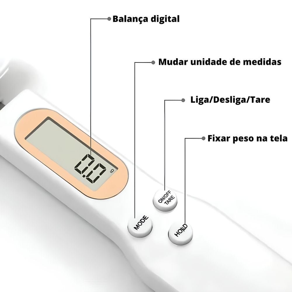 - Função Tara: zere o peso da colher para medir com mais precisão.