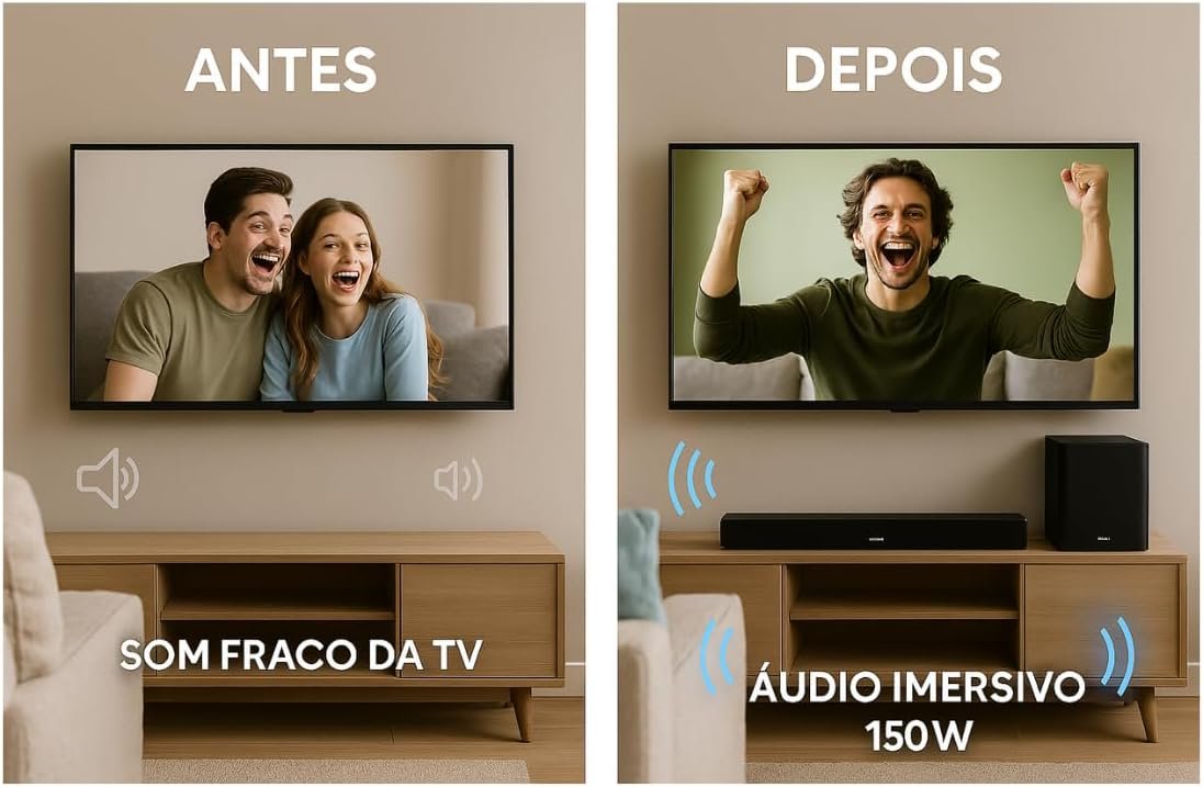 🔊 Som Potente e Imersivo – Com 150W de potência, proporciona áudio de alta qualidade para filmes, músicas e jogos.