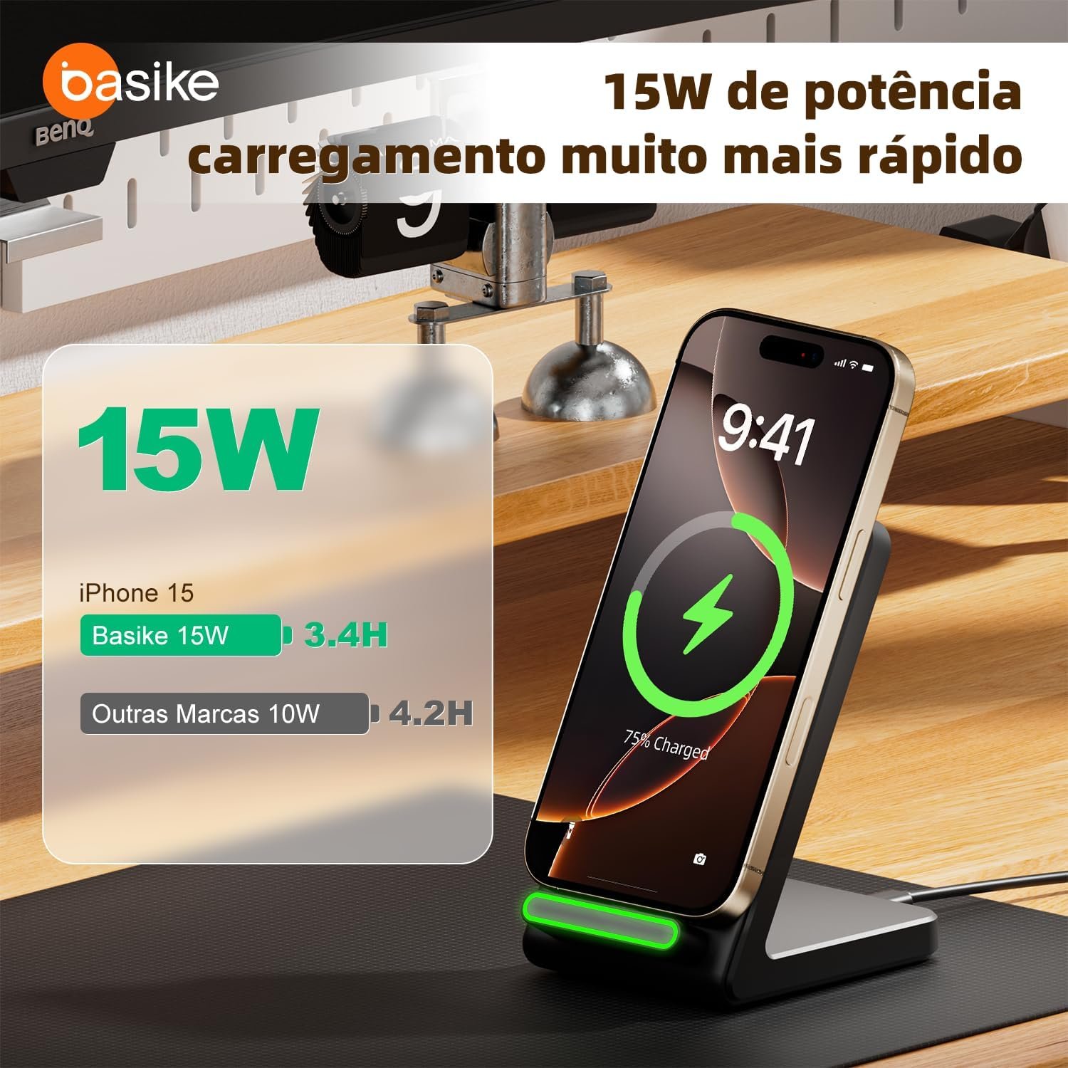 Basike Carregador Sem Fio, 15W Estação de Carregamento Rápido, Compatível iPhone16,15,14,13,12,11 (Pro, Pro Max)/XS/XR/XS/X/8(Plus) (Preto)