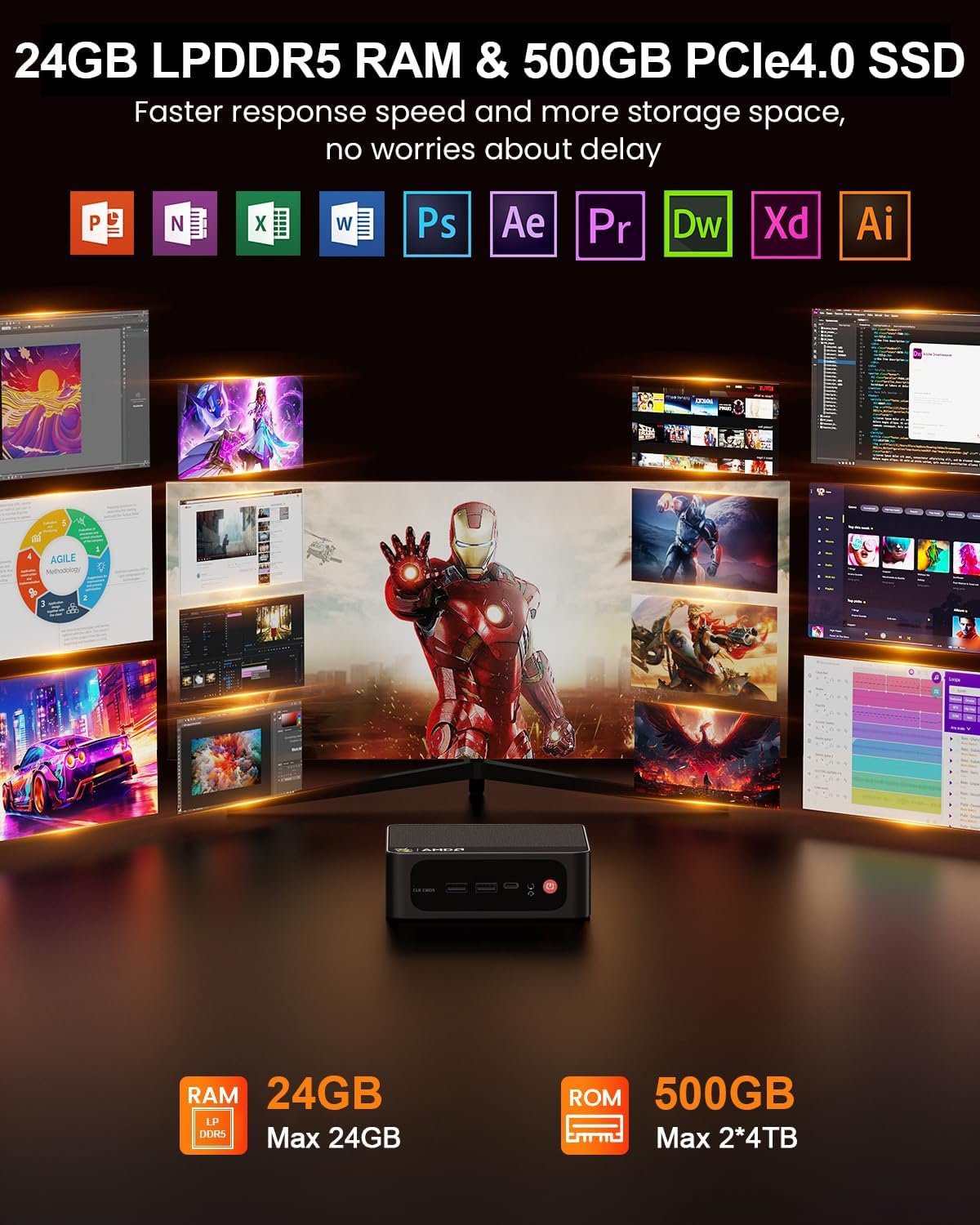 LPDDR5 de 24 GB e SSD PCIe4.0 de 500 GB: o mini PC EQR6 vem com 24 GB LPDDR5-5200 MHz RAM e SSD M.2 2280 PCIe 4.0×4 de 500 GB (dois slots SSD, máximo de 4 TB x 2, velocidade até 7000 MB/S, 2 vezes mais rápido do que PCIe 3.0 0). A grande capacidade ajuda a economizar mais programas grandes no computador e traz uma operação mais suave de multitarefas. SSD de alta velocidade permite um tempo de carregamento mais rápido de arquivos grandes e conteúdo de alta resolução