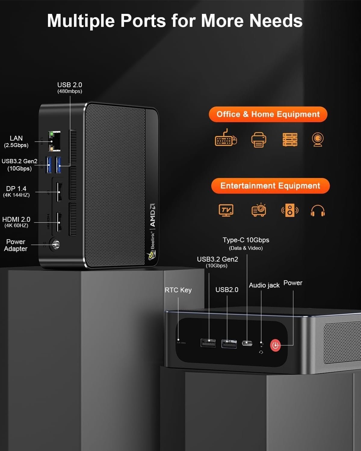 Atende às necessidades profundas: Beelink EQR6 mede 12,4 x 12,4 x 4,6 cm, apenas 1/40 do tamanho do PC de mesa padrão, é conveniente trazê-lo para um trabalho flexível. Este mini computador de mesa suporta monitores duplos 4K 60Hz através de duas portas HDMI para multitarefas eficientes. 3 portas USB3 e 1 * tipo C suportam transmissão de dados de até 10 Gbps, permitindo a transferência de arquivos em segundos. O Beelink PC suporta uma ampla gama de sistemas operacionais, Wake On LAN e Auto Power On, ótimo para usar como servidor para mídia (Plex ou FTP)