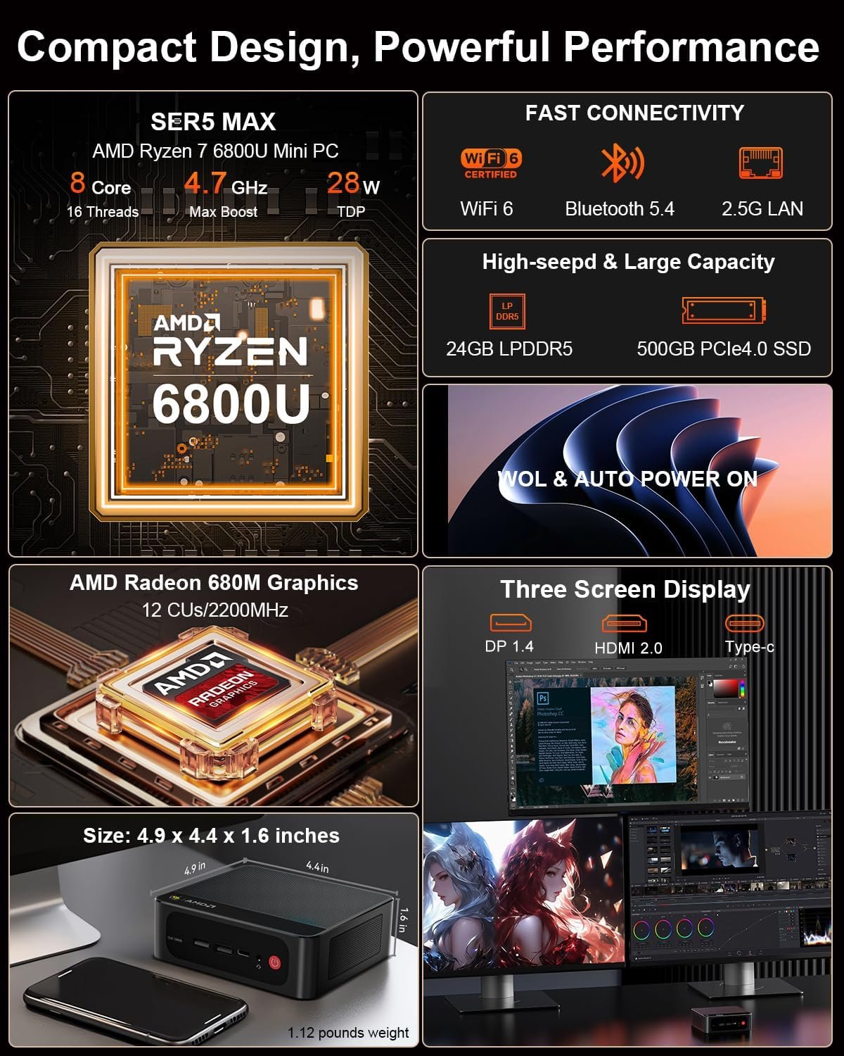 AMD Ryzen 5 6600U: Este Mini PC Beelink está equipado com AMD Ryzen 5 6600U (6 núcleos 12 threads, 2,9 GHz – 4,5 GHz, 16M L3 Cache). O desempenho do mini pc 6600U é melhorado em 12% em comparação com 5650U. Este mini computador é integrado com gráficos AMD Radeon 660M 6 core 1900 MHz, ideal para trabalho de escritório, edição de vídeos e imagens de alta resolução, reprodução de multimídia com KODI ou IPTV até 4K e jogos leves