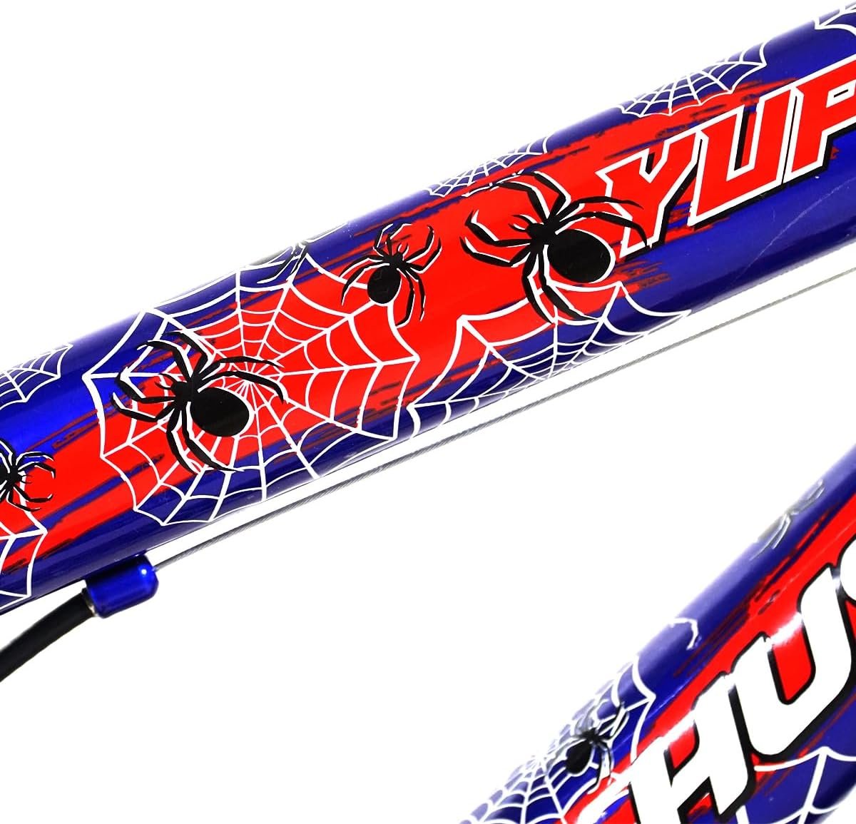 DESIGN ESPORTIVO: Bicicleta infantil com estrutura em alumínio, decorada com tema de aranha em azul e vermelho, perfeita para pequenos aventureiros