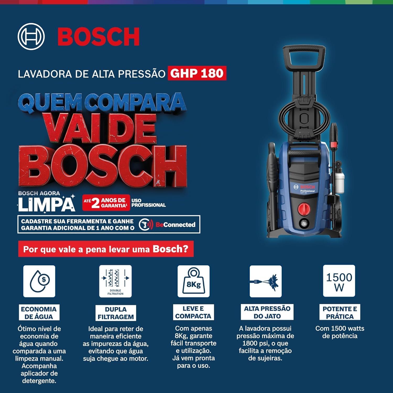 A lavadora de alta pressão Bosch GHP 180 possui 1500W, 220V e pressão máxima de 1800 psi. Conta com excelente desempenho e um peso compacto de 6.7 kg, garantindo um trabalho rápido e ótimo nível de economia de água quando comparada a uma limpeza manual. A dupla filtragem de água também é ideal para reter de maneira eficiente as impurezas da água, evitando que água suja chegue ao motor, proporcionando maior vida útil e evitando gastos com manutenção. Vem com acessórios incluídos que trazem mais flexibilidade na limpeza de diferentes superfícies e tipos de sujeira. Conta com alça dobrável para facilitar o transporte do equipamento para outros cômodos e já vem pronta para uso, sem necessidade de montagem. A lavadora Bosch GHP 180 acompanha: 1 Pistola e lança de alta pressão, 1 bico de jato rotativo (turbo), 1 bico de jato variável, 1 aplicador de detergente, 1 filtro externo, 1 adaptador de mangueira de engate rápido e 1 mangueira de 5 Metros. Garantia 1 ano Bosch + 1 ano adicional fazendo o cadastro no aplicativo BeConnected.