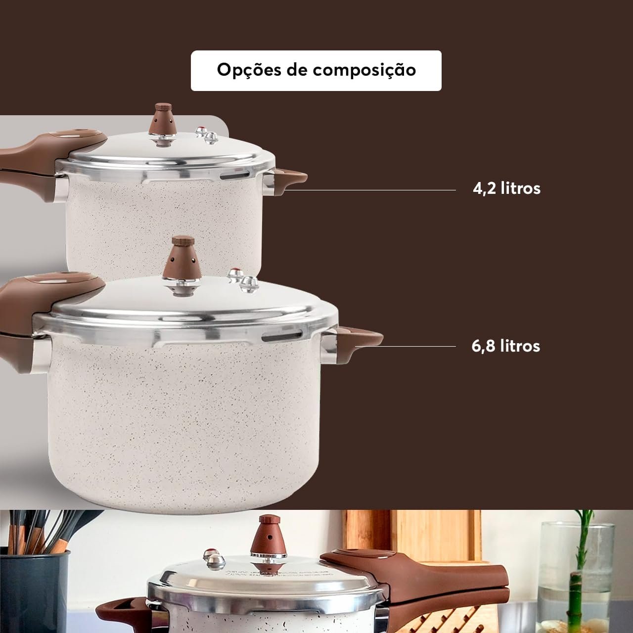 BELEZA E SOFISTICAÇÃO: Design moderno com pintura externa na elegante cor vanilla, que traz leveza e charme à cozinha. As alças e cabos em soft touch oferecem conforto térmico e firmeza no manuseio. Destaque para a panela de pressão Pressure, com capacidade de 4,2 litros.