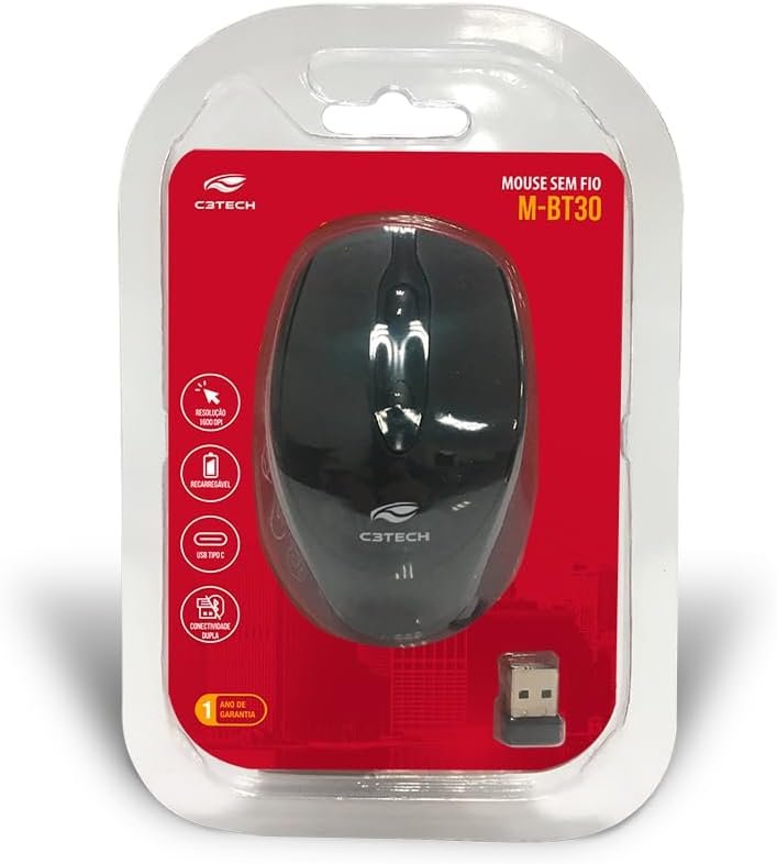 C3Tech mouse Bluetooth 5.0 e sem fio 2.4GHz M-BT30BK, Preto, Bateria recarregavel, 1600 DPI Ambidestro Plug and Play compativel com Windows, MACos, Linux, Chrome