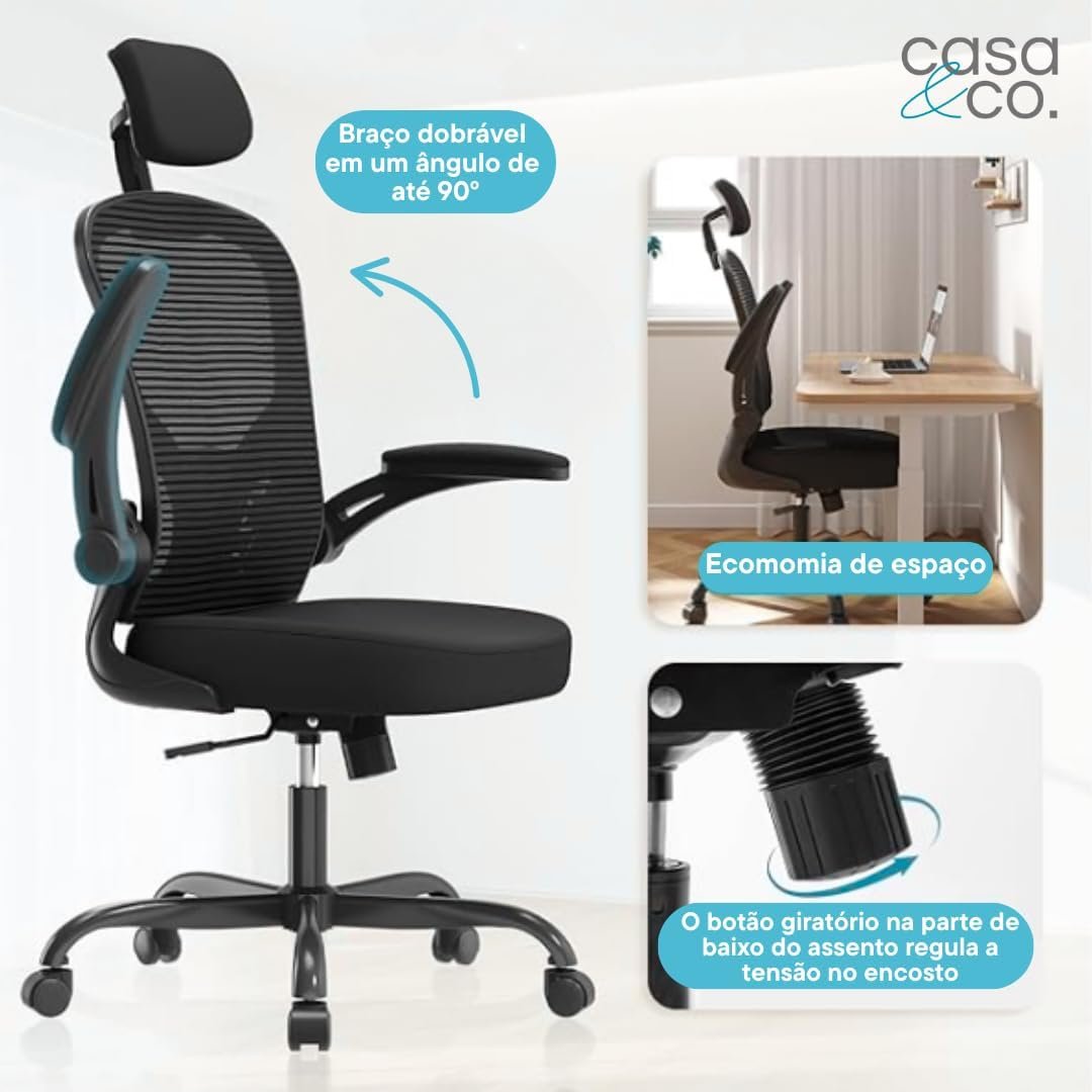 🔄 Apoios de braço dobráveis – Permitem aproximar a cadeira da mesa, ganhar espaço e adaptar ao seu estilo.