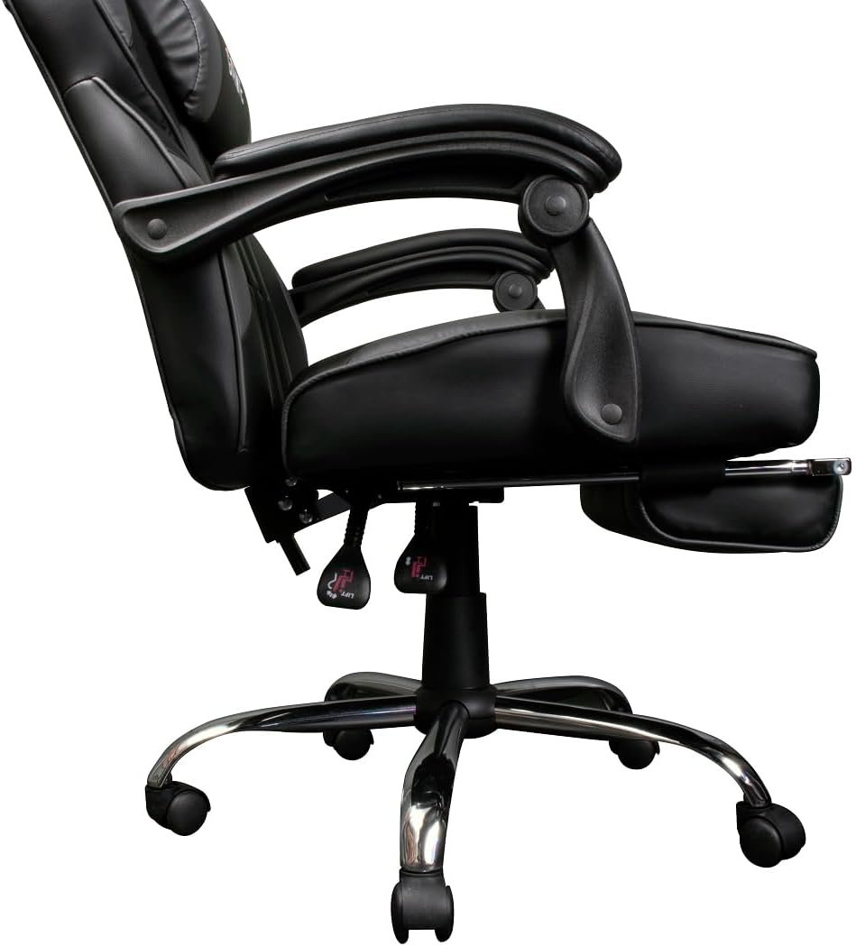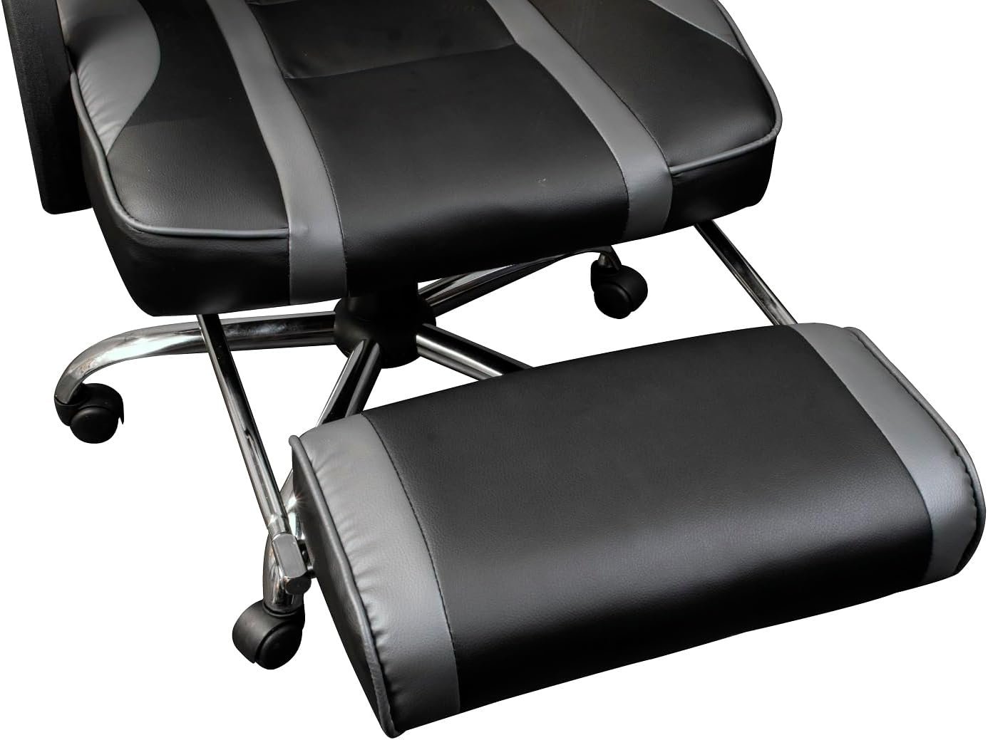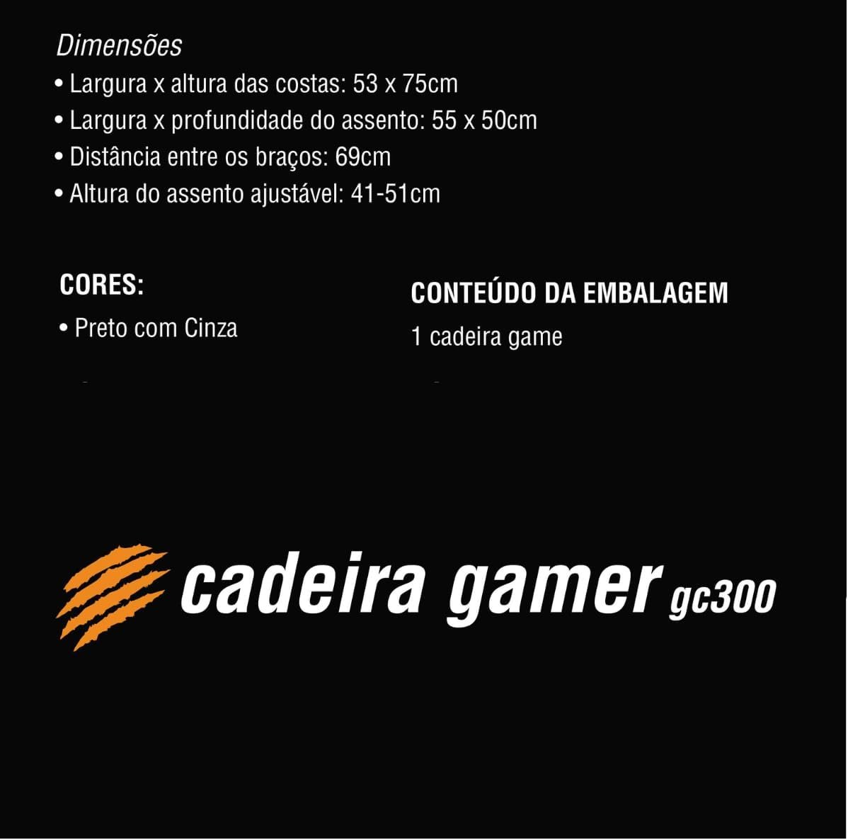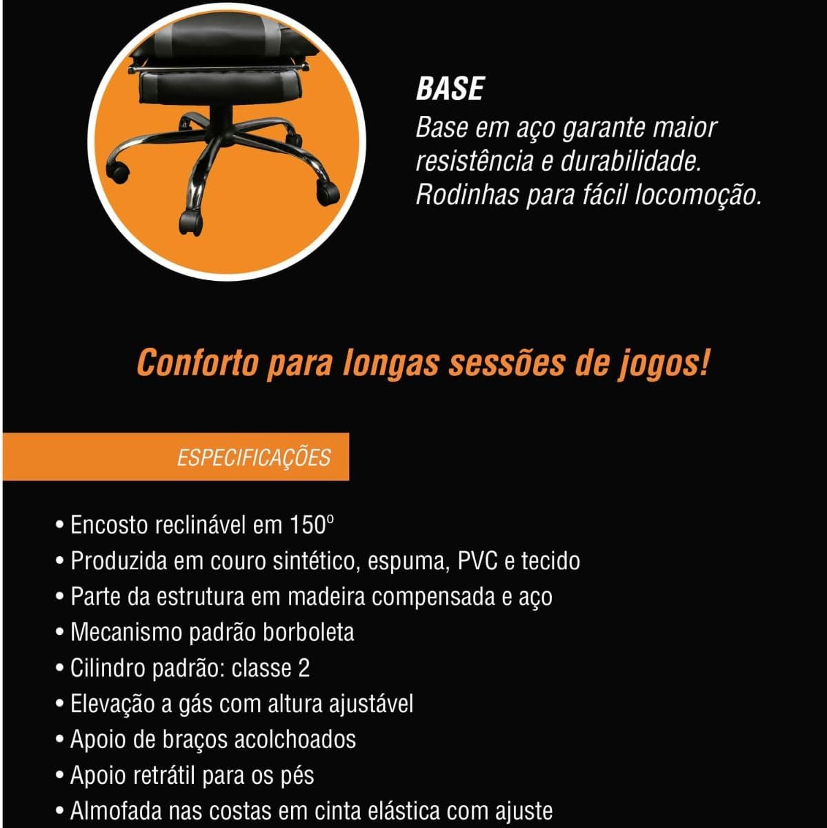 GAME CHAIR produzida em couro PU mesclado com tecido, apoio de braço acolchoado, tipo de mecanismo padrão borboleta, elevação de gás com altura ajustável, costas reclináveis, apoio retrátil para pés, almofada nas costas em cinta elástica com ajuste de posicionamento, peso máximo recomendado 150kg.