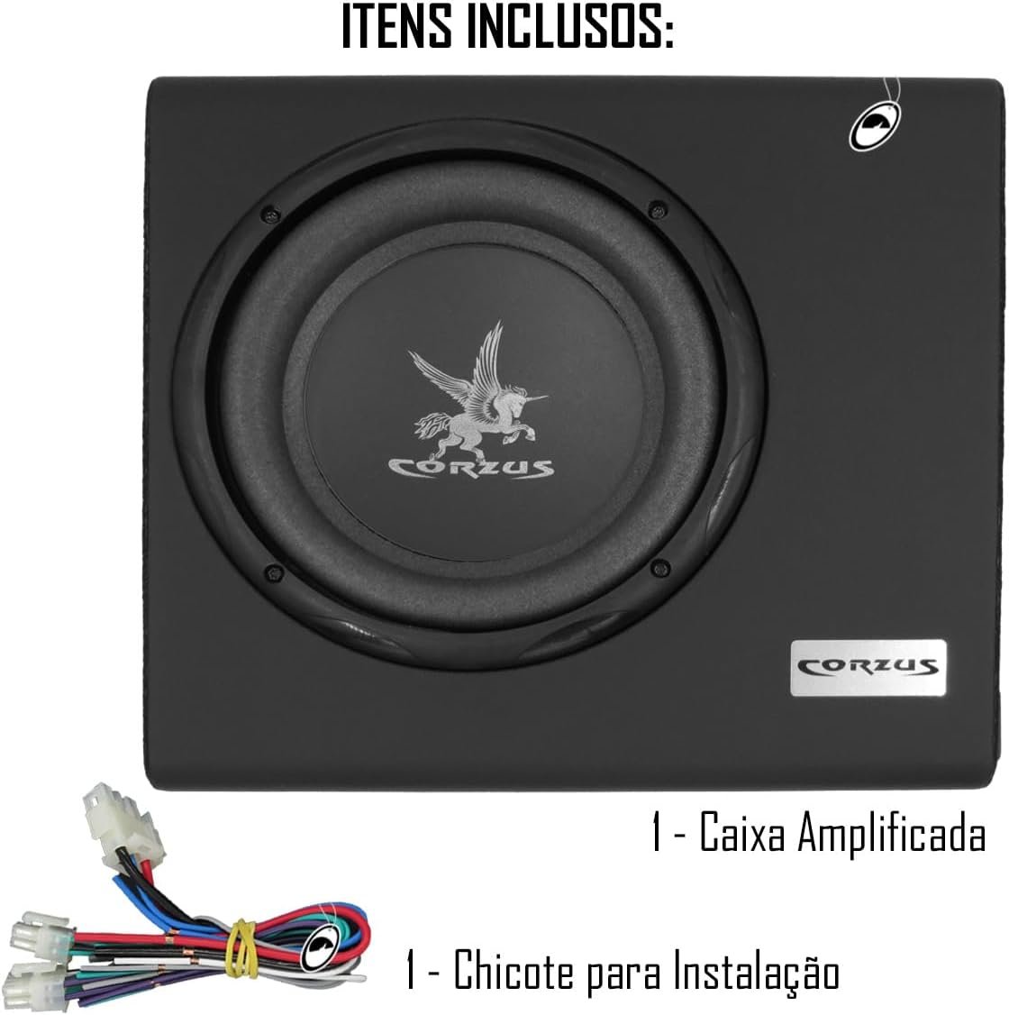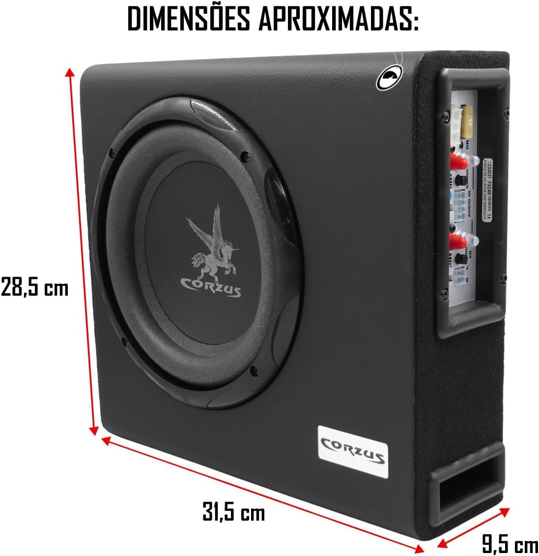 ℹ️ [INFORMAÇÕES TÉCNICAS] Produto: Novo / Marca: Corzus / Modelo: CXS303 MINI SLIM / Tamanho do subwoofer: 8´´ – Bobina Simples 4 OHMS / Potência do amplificador (Rms): 350W / Potência do subwoofer (Rms): 200W / Potência de saída estéreo (Rms): 150W (2 Canais) / Cor: Preta / Alimentação: 12v / Entrada de áudio: Fio E Rca / Tipo: Caixa acústica Mini Slim / Aplicação: Carro