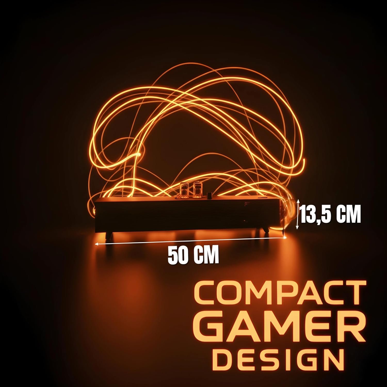 Detalhes visuais modernos com tubos LED duplos — estilo gamer com toque futurista.