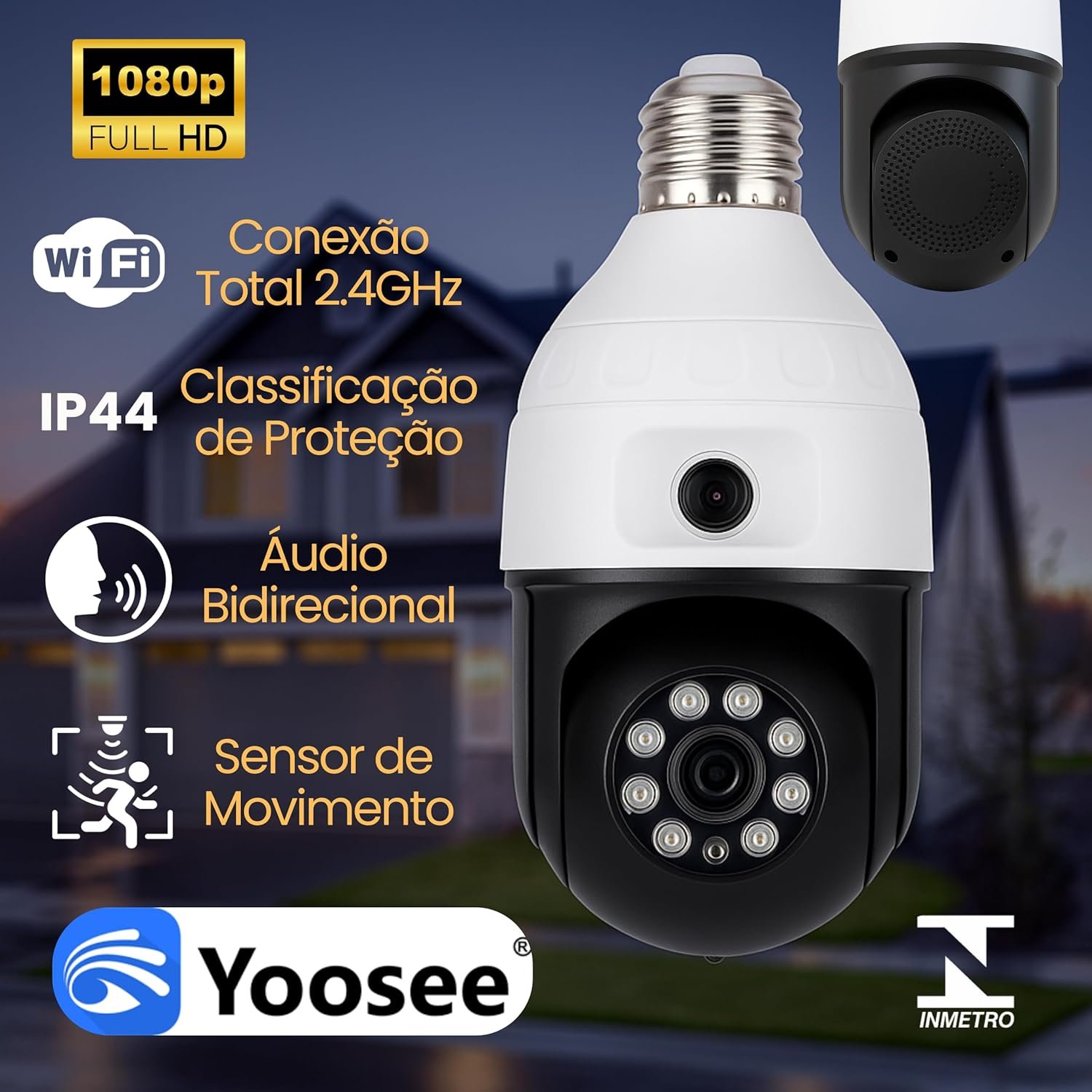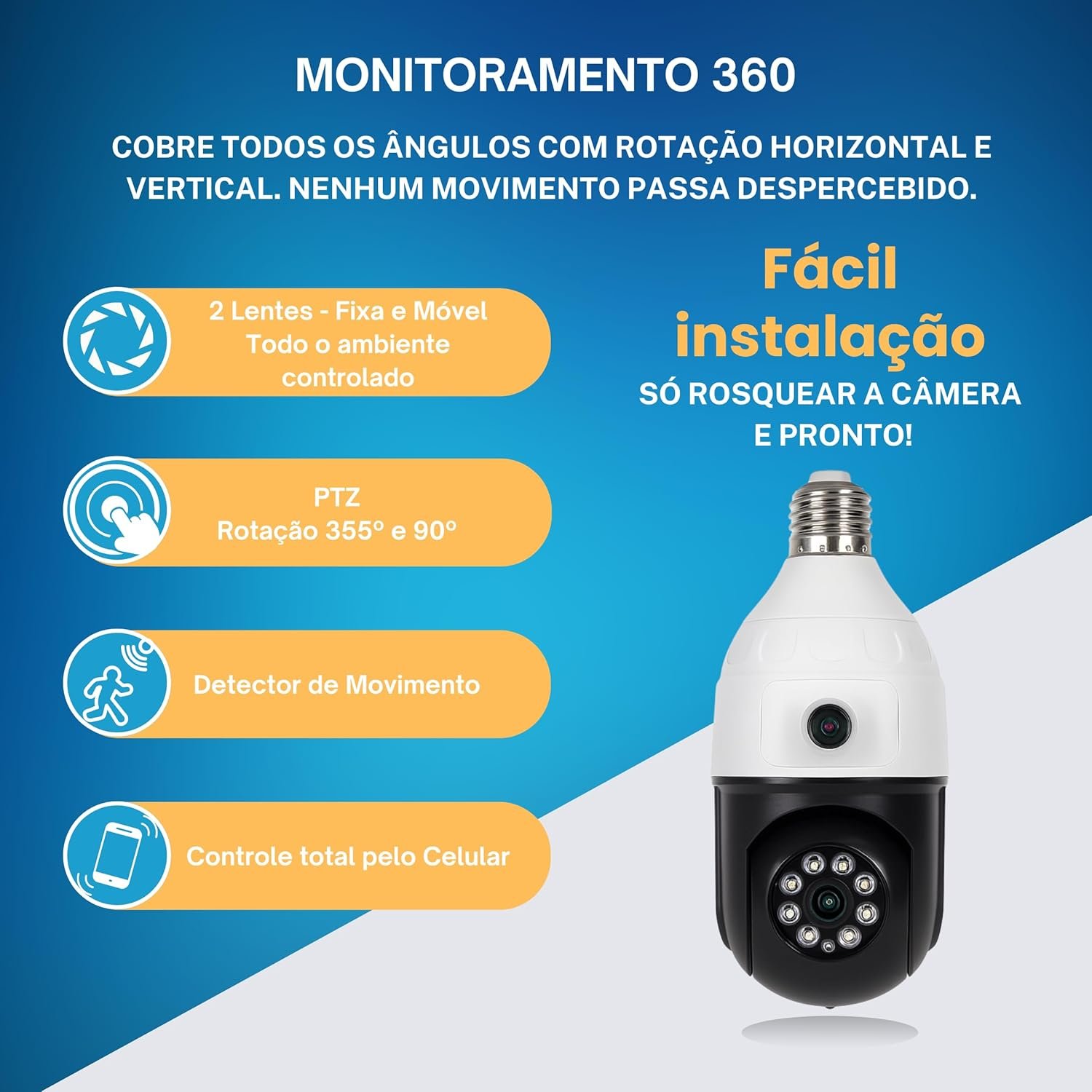 - Tipo: Câmera lâmpada Wi-Fi PTZ 360°
