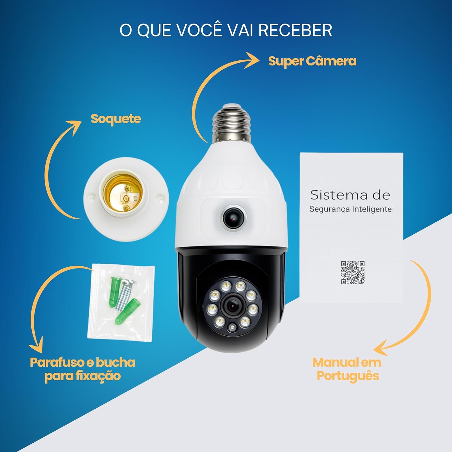 A Câmera Lâmpada Wi-Fi 360° com Lente Dupla proporciona vigilância completa com praticidade e estilo. Basta conectar no soquete comum E27 e transformá-lo em um sistema de monitoramento moderno e eficiente.