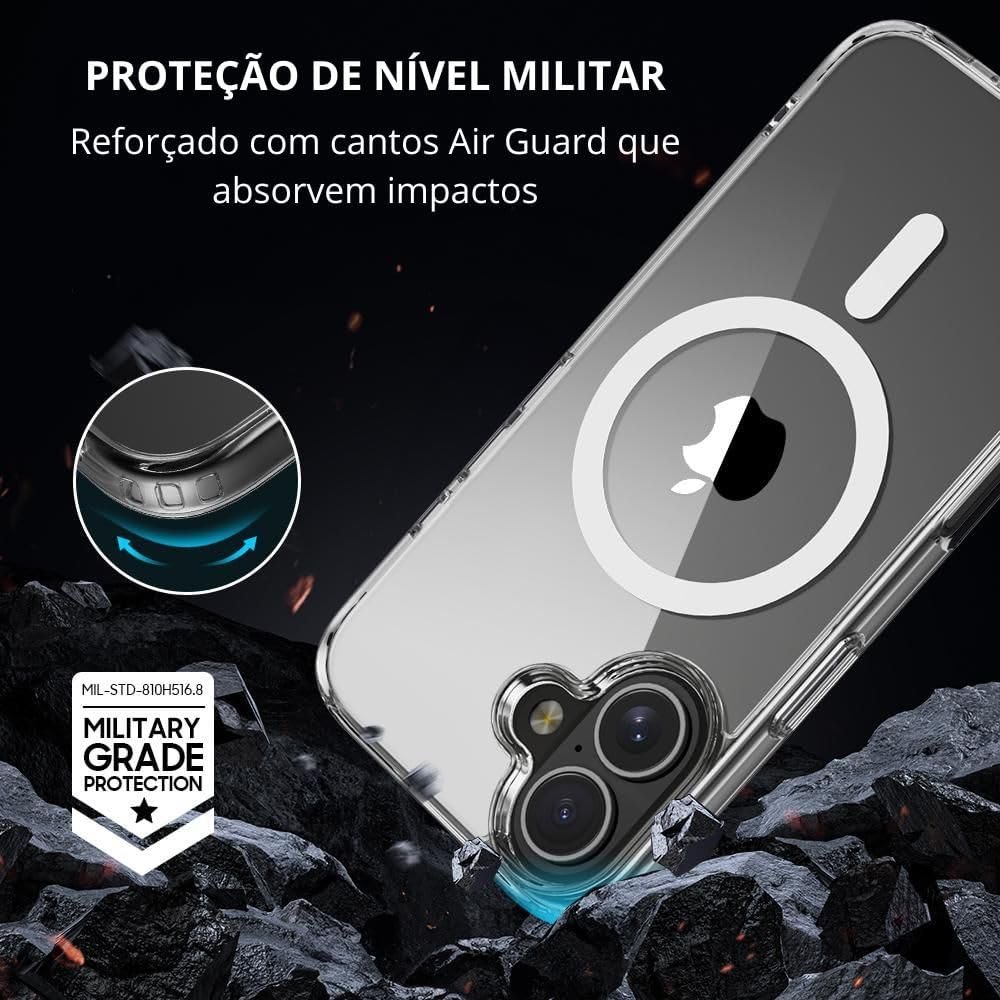 Recursos que oferecem proteção, beleza e praticidade Compatível com Mag-Safe para carregamento e acessórios magnéticos Proteção de nível militar com cantos reforçados Air Guard Material premium com tecnologia anti-amarelamento duradoura Bordas elevadas que protegem câmera e tela contra quedas e riscos Design elegante, fino e totalmente transparente para valorizar seu iPhone
