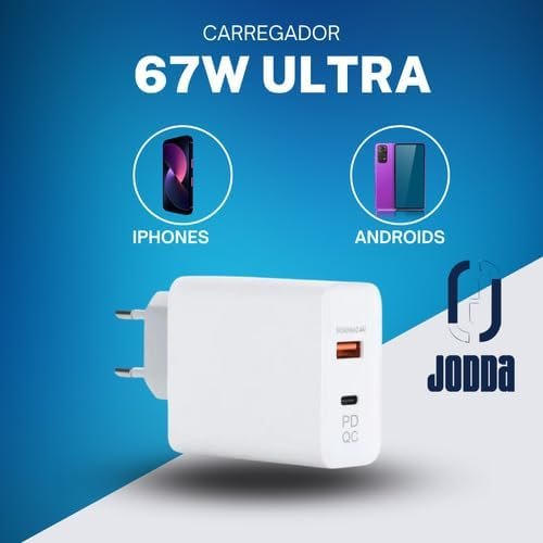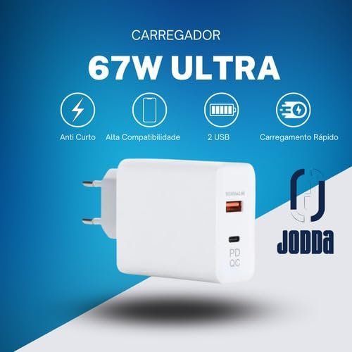 Rápido e Eficiente: Nosso Carregador de 67W proporciona uma carga ultrarrápida para uma ampla gama de dispositivos, garantindo que você nunca mais perca tempo esperando pela bateria do seu celular ou tablet.