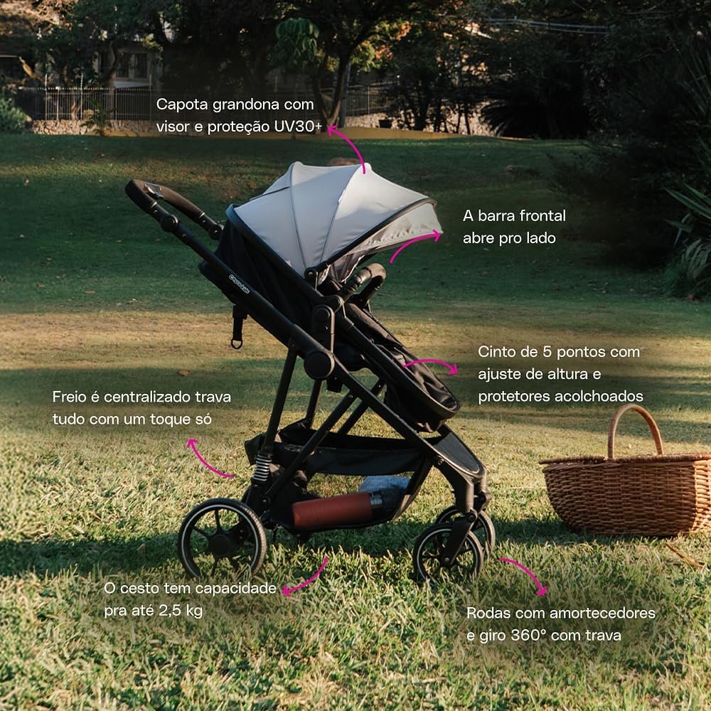 Além disso, a capota grandona com visor, aba de sol e proteção UV30+, junto com o cesto espaçoso de acesso fácil que suporta até 2,5kg, fazem dele um carrinho supercompleto.