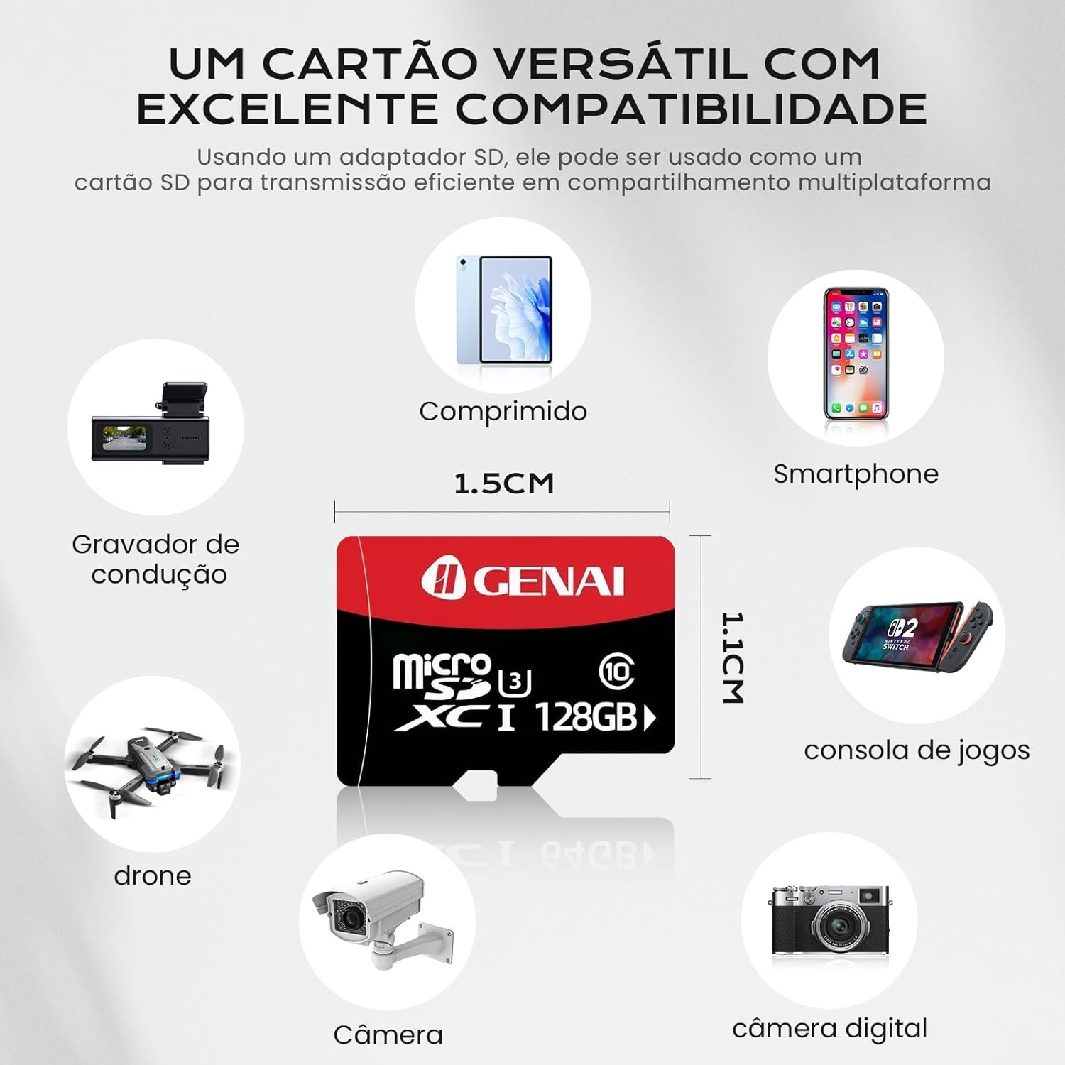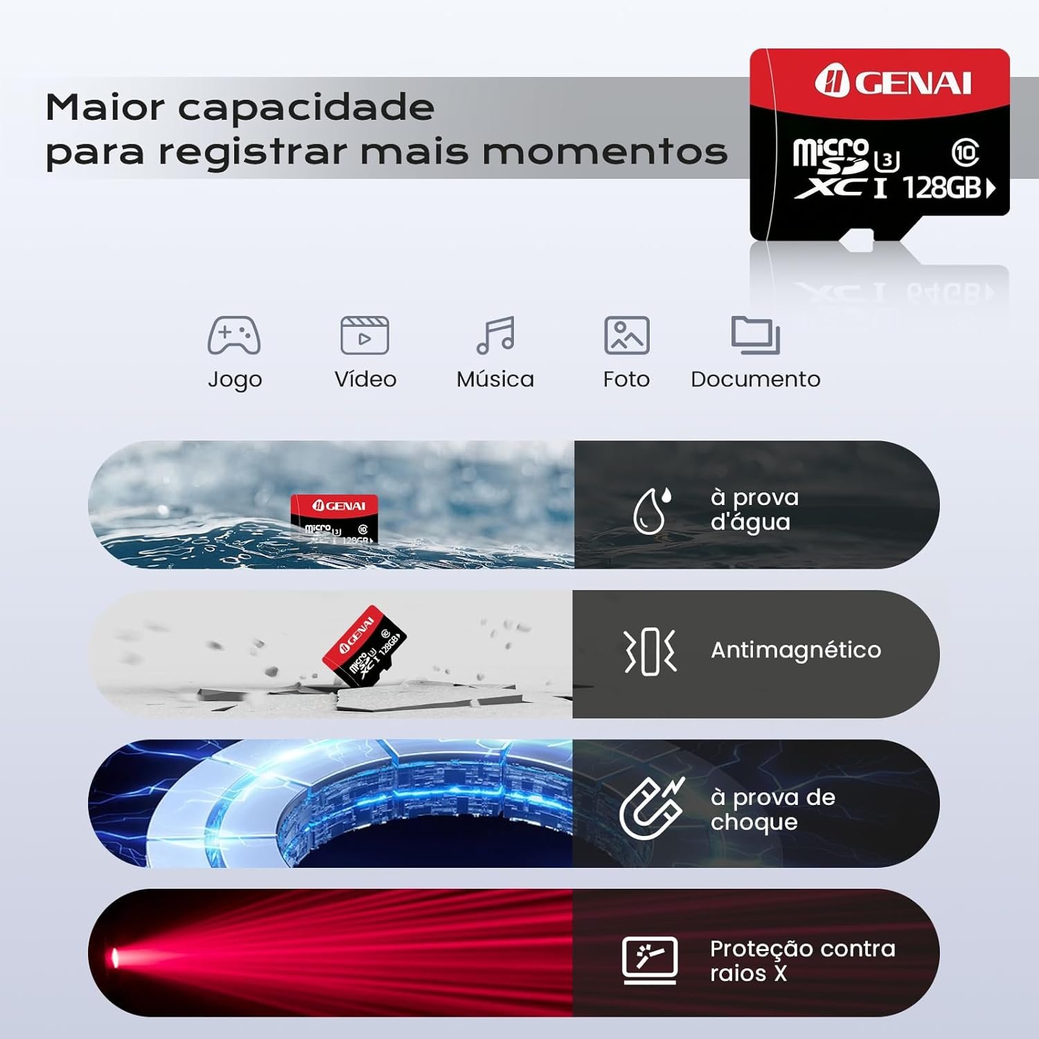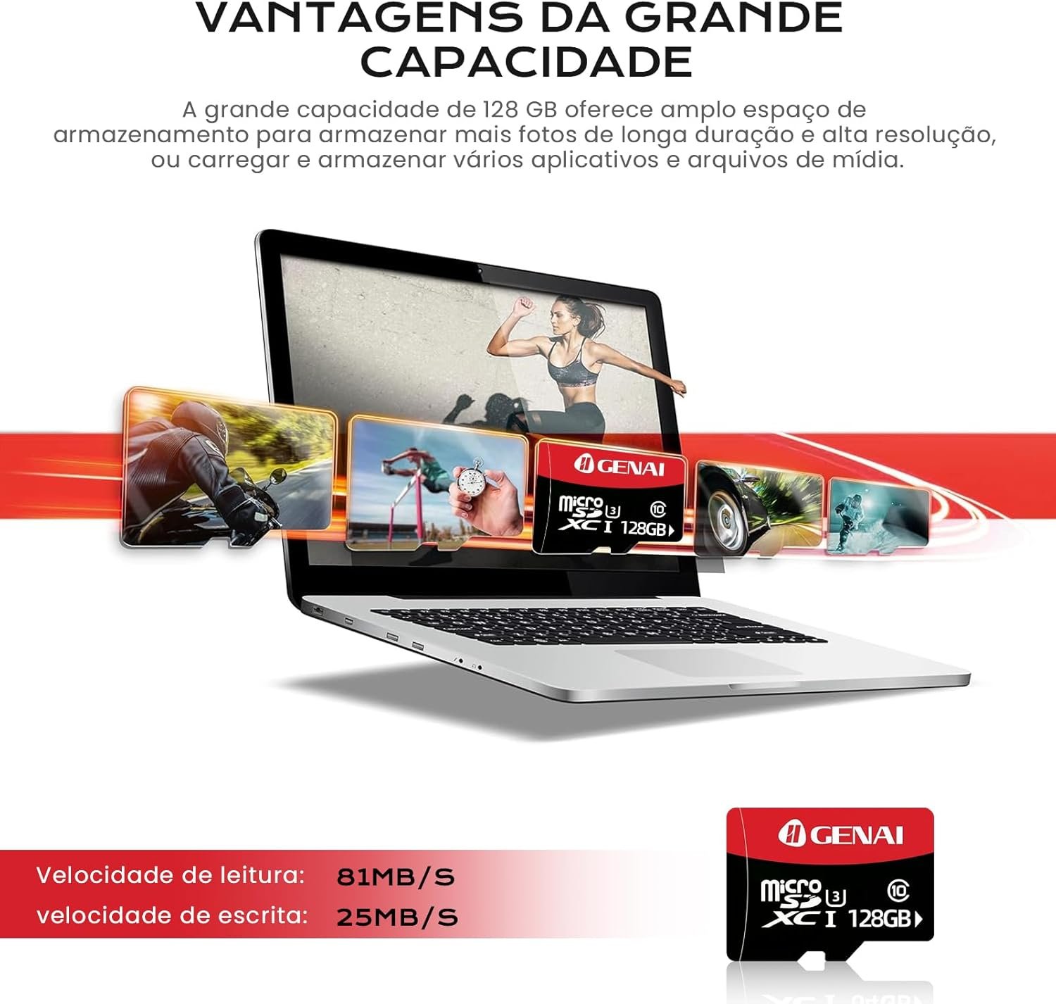 Um cartão de memória de 128 GB oferece amplo espaço para armazenar grandes quantidades de fotos, vídeos, músicas e outros arquivos digitais.