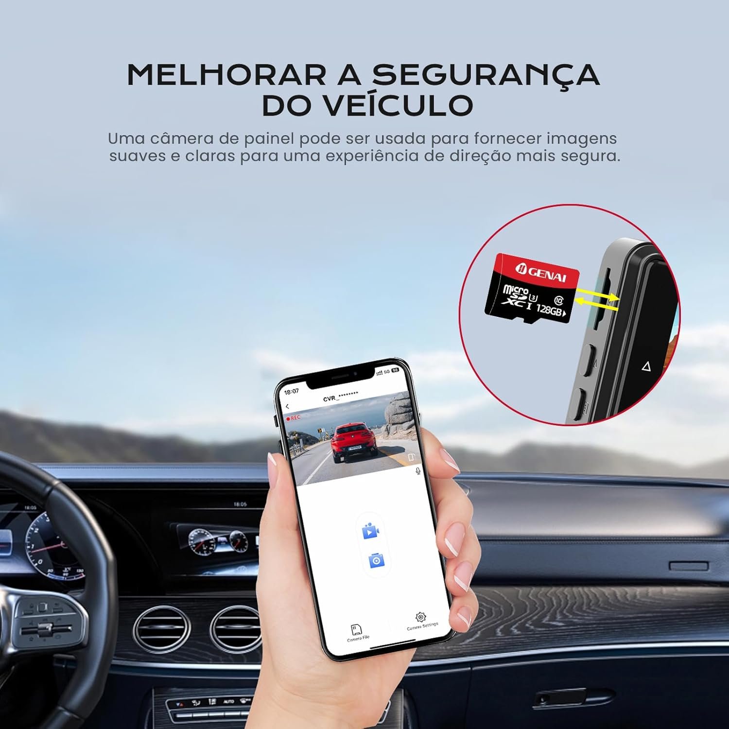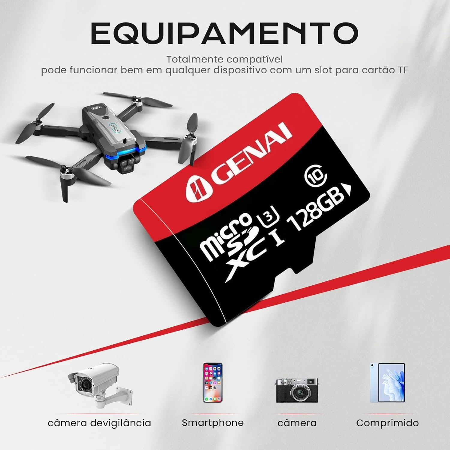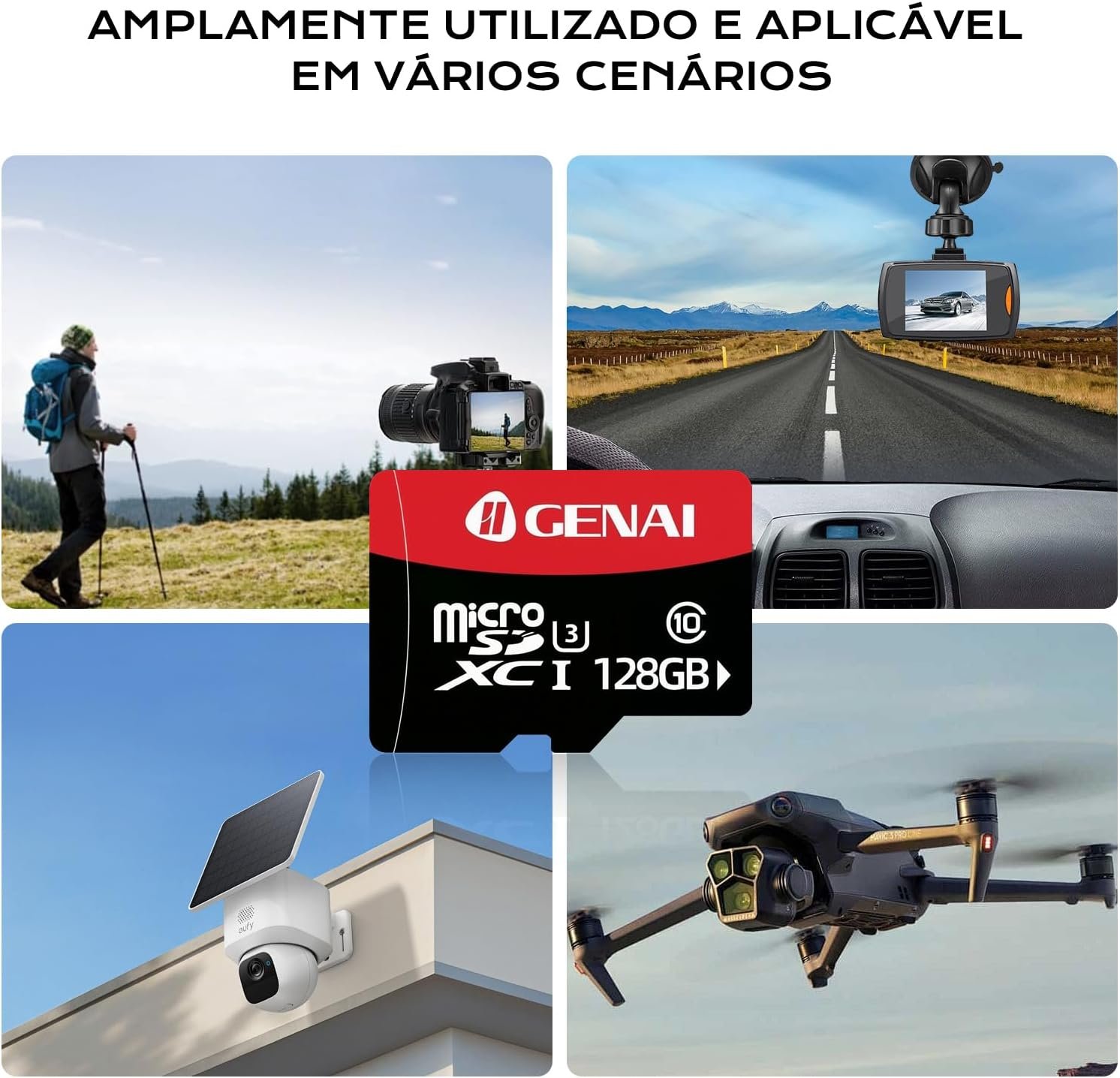 Um cartão de memória de 128 GB oferece amplo espaço para armazenar grandes quantidades de fotos, vídeos, músicas e outros arquivos digitais.