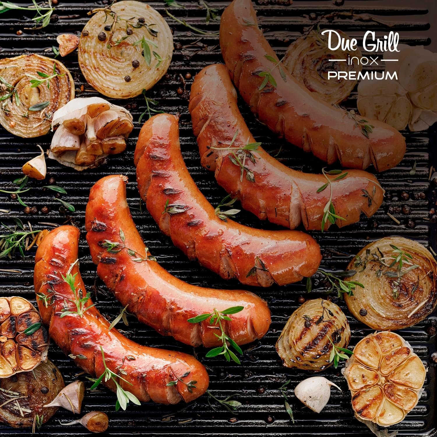 CHAPA LISA + GRILL: O Due Grill é composto por chapa lisa e grill e permite preparar diversos tipos de pratos. As chapas são perfeitas para vegetais, pães e carnes. Já o grill é indicado para hambúrgueres e espetinhos.