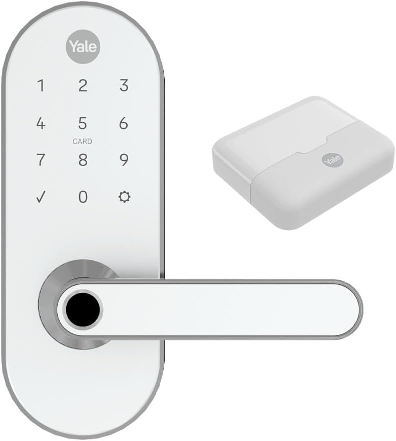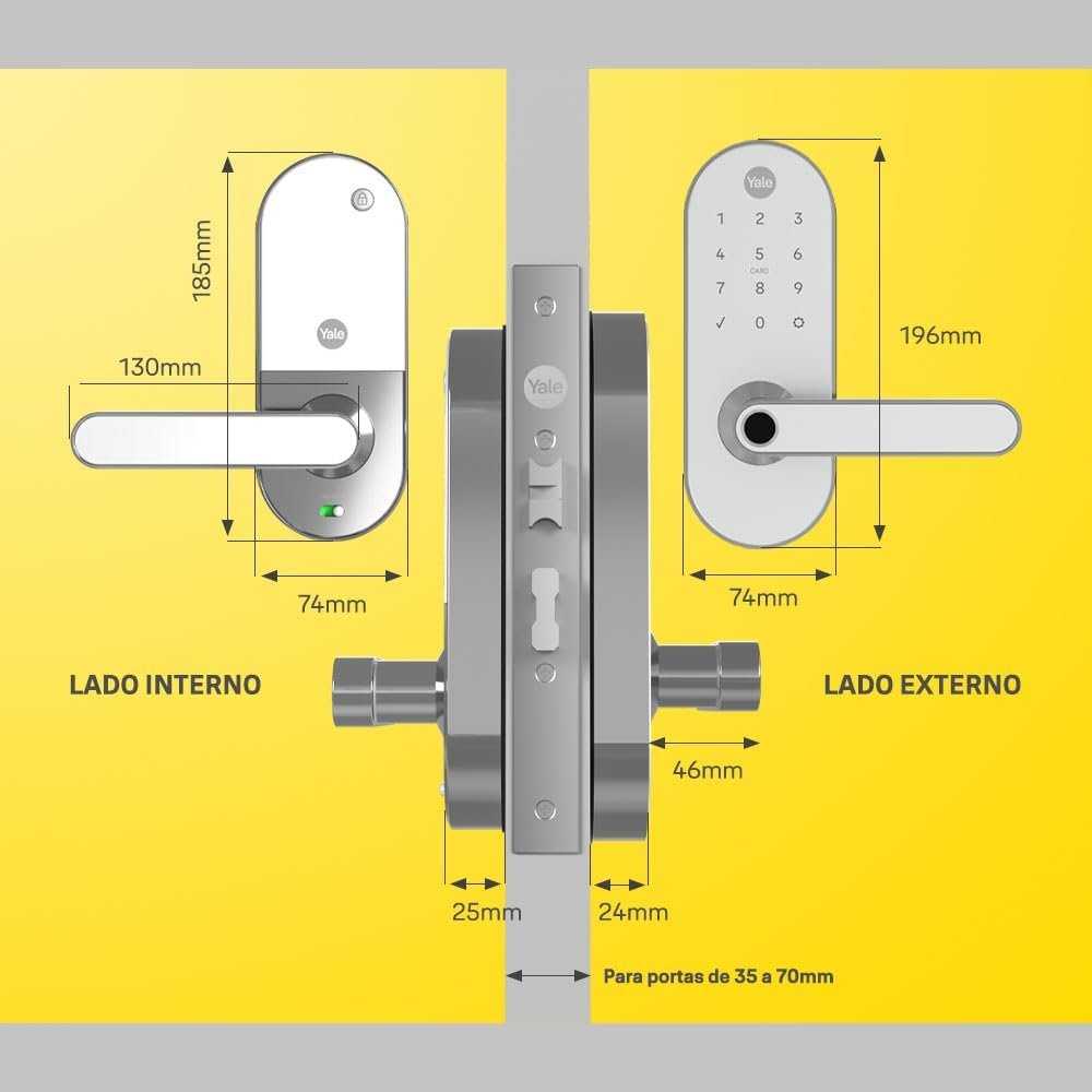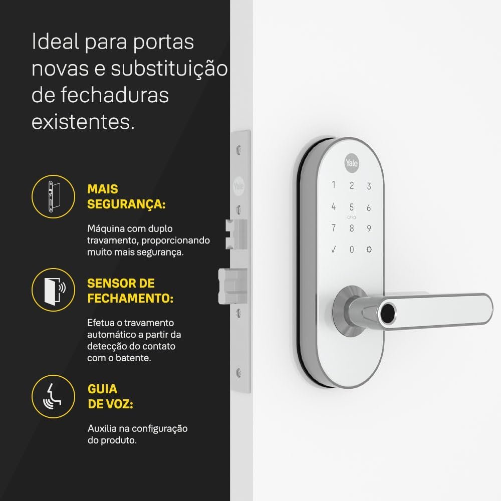 Garanta praticidade e segurança com a fechadura digital Yale YMC 420W. Com um design moderno nas cores branca e cromada, essa fechadura oferece múltiplas formas de acesso, como biometria, senha, cartão e chave, além de permitir o controle via aplicativo Yale Connect.