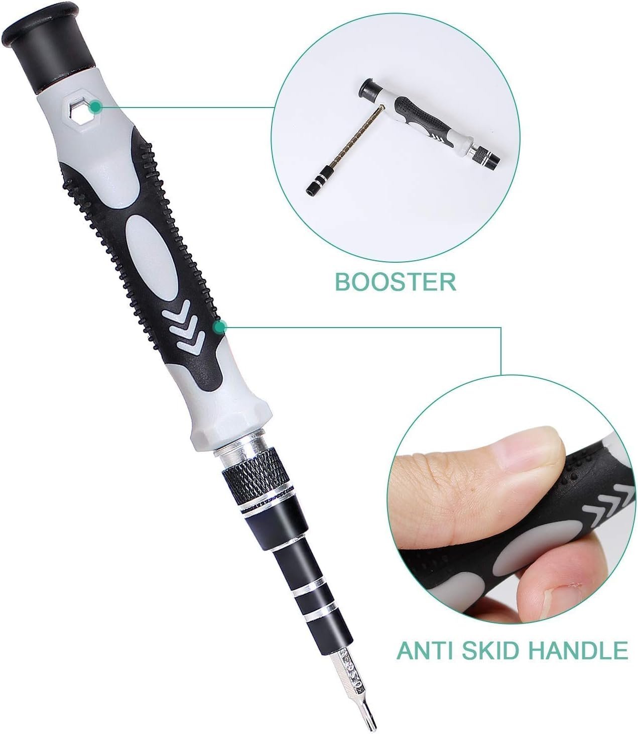Reparo de precisão: haste de extensão adicional de haste flexível de até 60 mm de comprimento ajustável e uma haste flexível, ideal para trabalho com aparelho de som. Conjunto de chaves de fenda pequenas disponíveis em extensões flexíveis e rígidas para cantos estreitos. Também possui pinças antiestáticas e alças antiderrapantes de silicone para todos os tipos de uso.