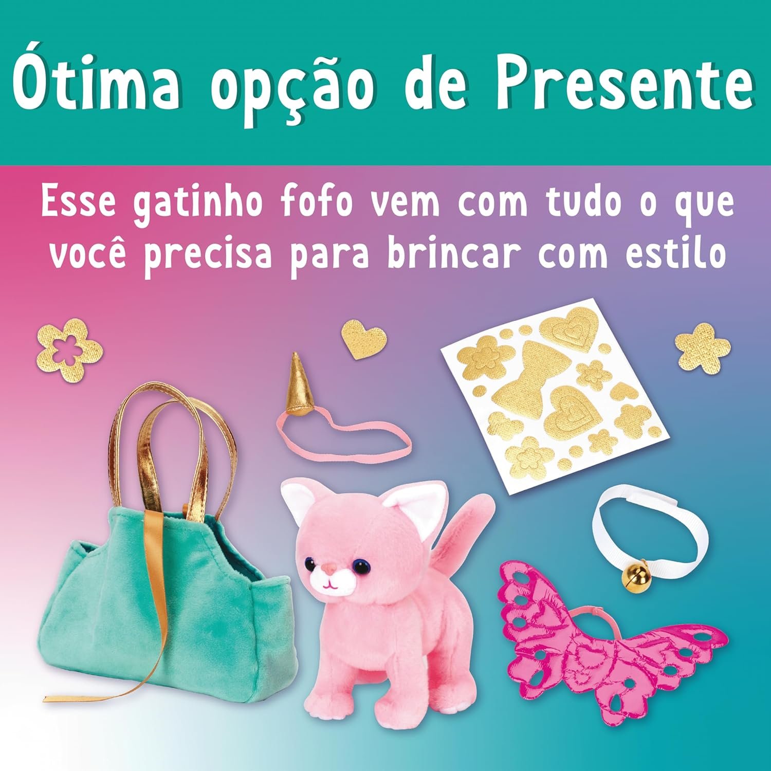 BOLSA DE TRANSPORTE – ideal para diversão em qualquer lugar! Essa bolsa aveludada pode ser decorada com incríveis adesivos dourados. Recomendado para crianças acima de 4 anos Gatinho de pelúcia 12,2cm x 15,2cm x 8,9cm Bolsa de veludo com 17,8 cm x 12cm x 5,7 cm Coleira de fita com sino Asas de borboleta Adesivos metálicos dourados Tiara de unicórnio Certificado de adoção (nas instruções)