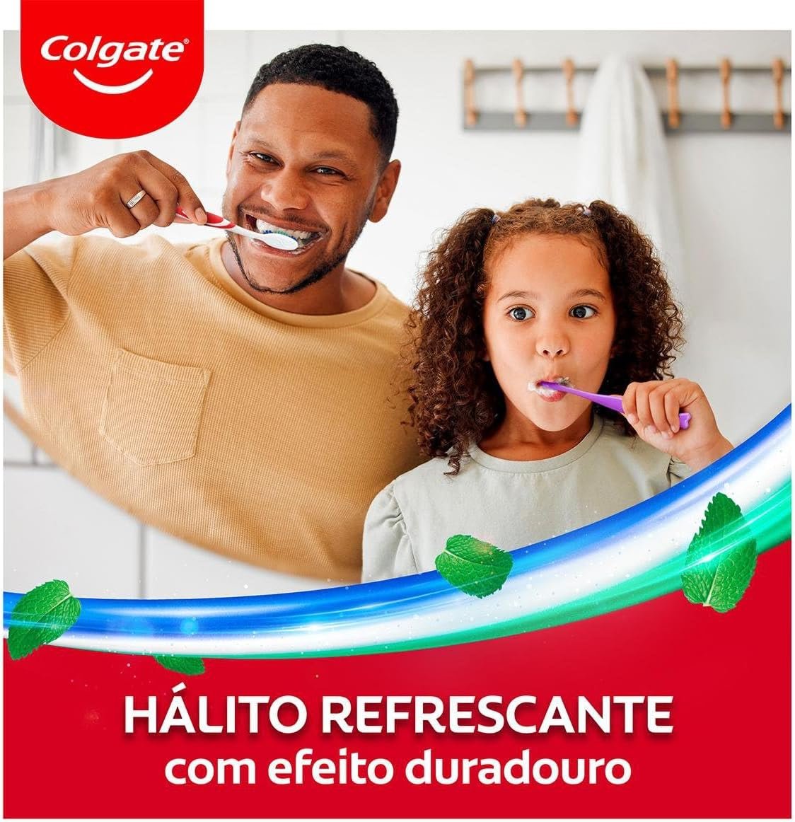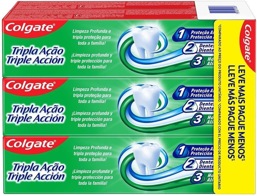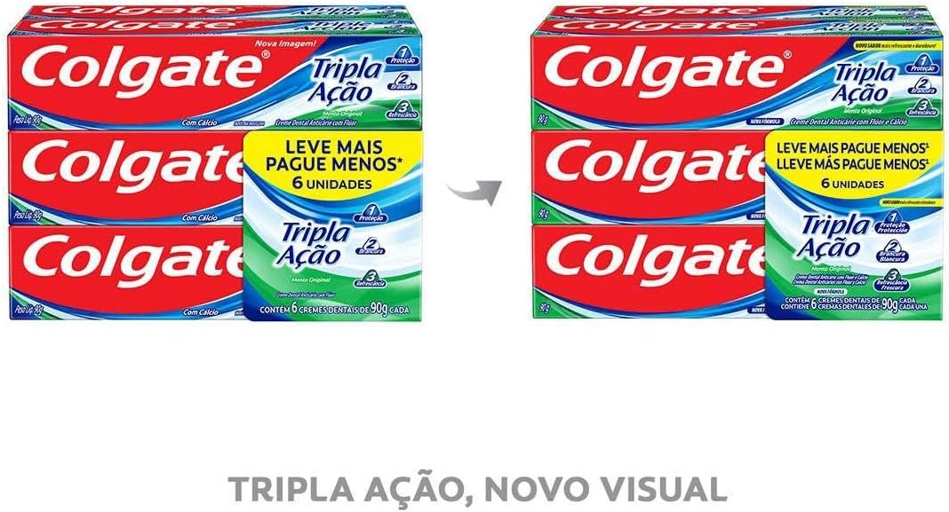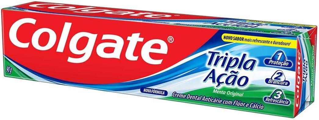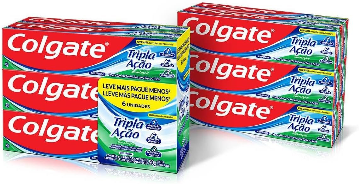 A pasta de dente Colgate Tripla Ação sabor menta original proporciona tripla proteção para você e sua família: dentes brancos, protegidos e um hálito refrescante. Benefícios: Sua fórmula com flúor previne as cáries, proporcionando proteção para você e sua família Ajuda a remover as manchas amarelas para manter os seus dentes brancos Possui delicioso sabor de menta, que combate o mau hálito e deixa a sua boca com uma incrível sensação de refrescância Embalagem com 6 unidades, com melhor custo benefício para você e sua família