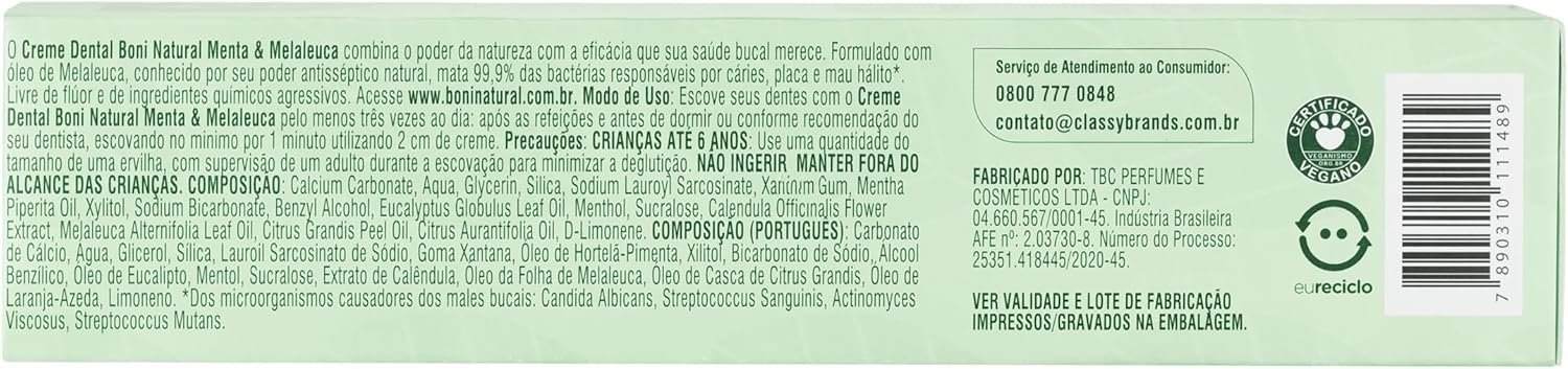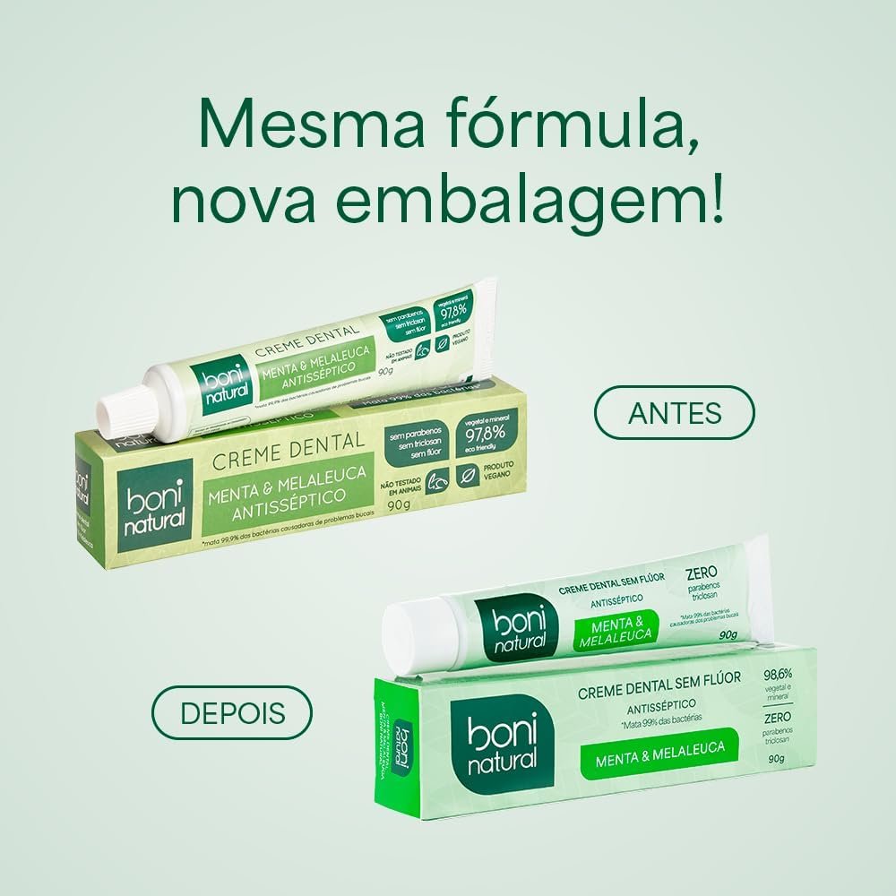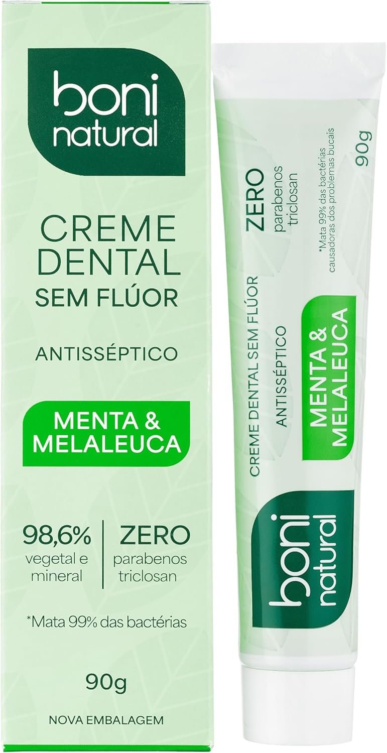 O novo creme dental vegano, natural e sem flúor boni natural menta melaleuca é uma resposta á nova consciência que todos nós buscamos. O produto não contém ingredientes sintéticos e químicos que mostraram alguns estudos científicos, algum nível de toxidade e/ou perigo á saúde e ao meio-ambiente. Sua fórmula mata 99, 9% das bactérias causadoras das cáries, placa e do mau hálito.