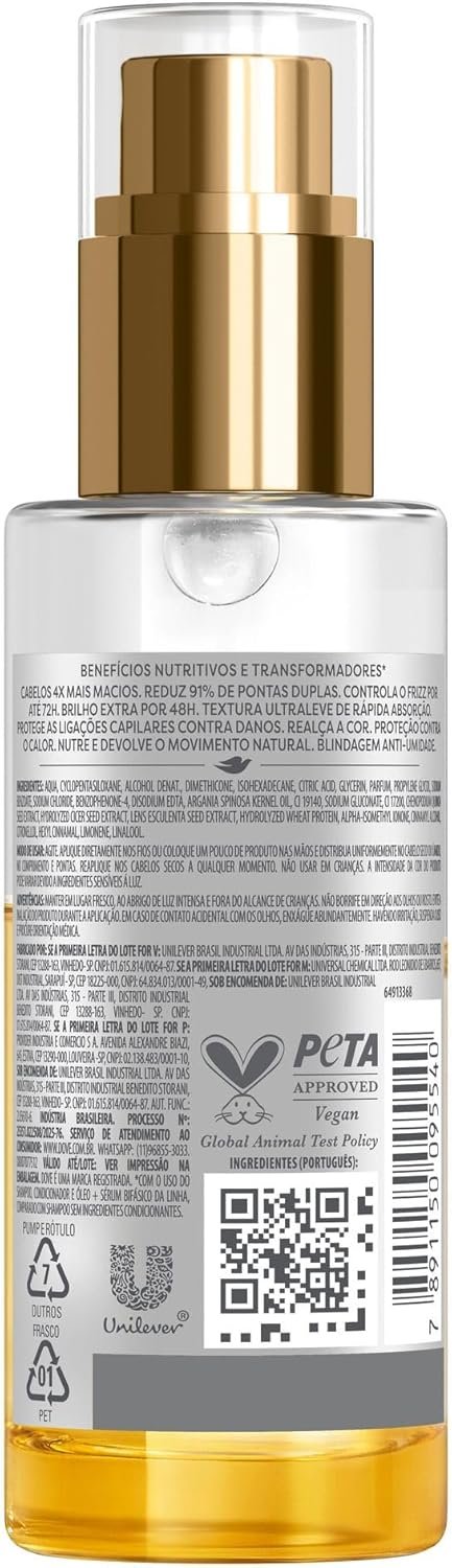Dove Óleo Sérum Bifásico Bond Repair + Peptídeo é um óleo capilar para reconstrução de pontas danificadas que nutre e protege enquanto fortalece as ligações internas dos fios