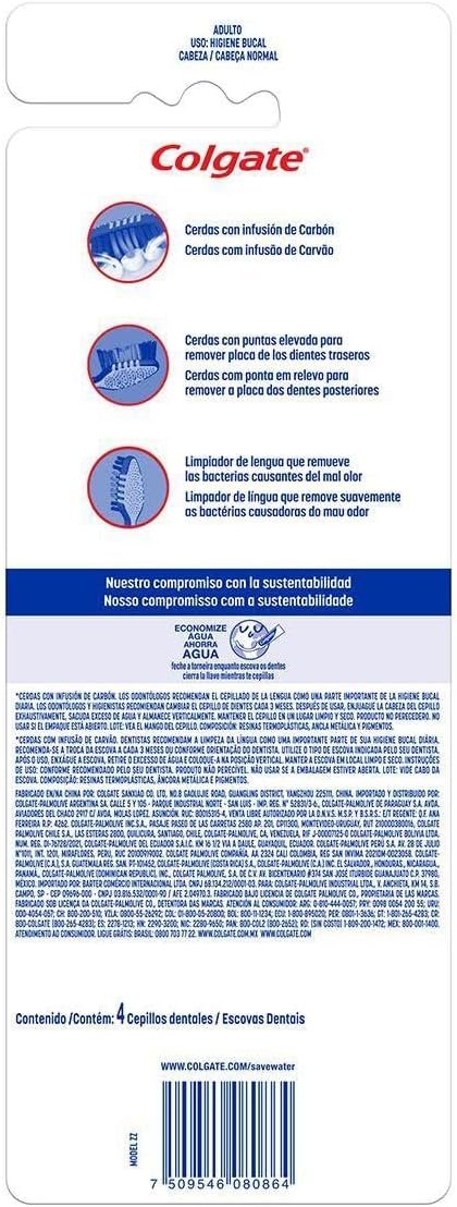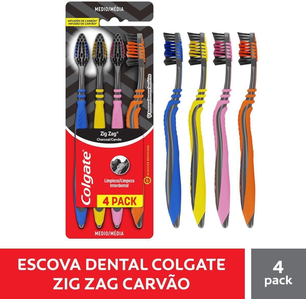 A escova Colgate Zig Zag Charcoal aparece com um design diferenciado e moderno. Possui cerdas interdentais com infusão de carvão e remoção ativa da placa bacteriana. Além de ser uma embalagem com 4 unidades, uma opção mais acessível.Benefícios:Limpeza interdental – Ponta elevada para alcançar e remover a placa dos dentes posteriores de difícil acessoCom limpador de língua suave que ajuda remover as bactérias que causam mau hálitoCerdas com infusão de carvão ativado