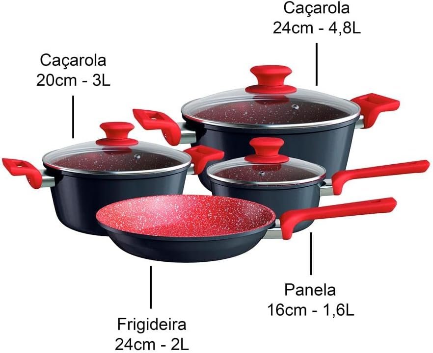 Medidas individuais: Frigideira 24 cm – 5,5 cm x 24,5 cm x 41,5 cm Caçarola com tampa 20 cm – 21,5 cm x 33,5 cm x 16,5 cm Caçarola com tampa 24 cm – 25,5 cm x 38 cm x 17 cm Panela com tampa 16 cm – 17,5 cm x 34 cm x 13,5 cm Frigideira 24 cm – 2 L Caçarola 20 cm – 3 L Caçarola 24 cm – 4,8 L Panela 16 cm – 1,6 L