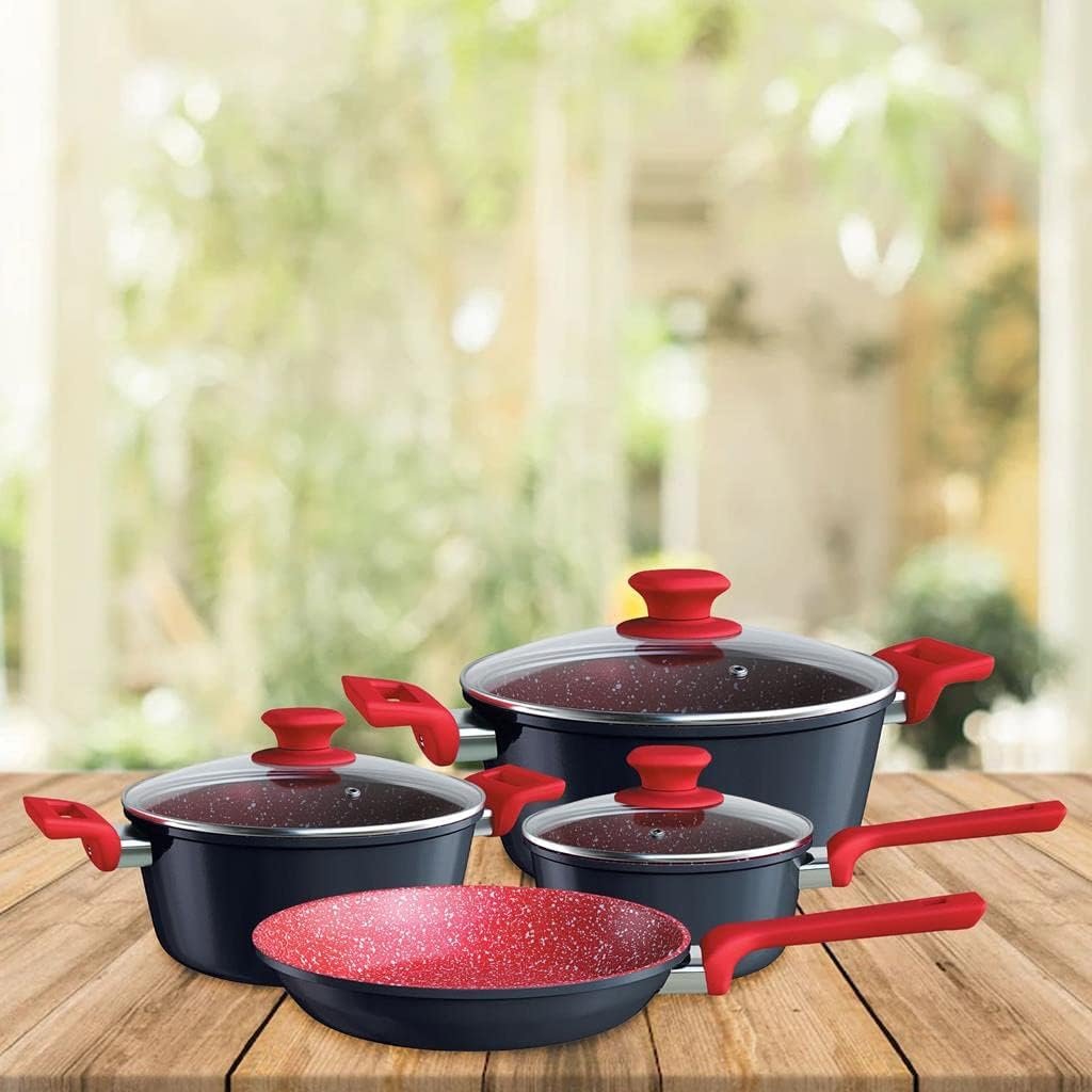 Conjunto de panelas 4 peças de alumínio com antiaderente e 5mm de espessura na borda, tampa de vidro temperado com saída de vapor e cabo com pintura siliconada soft Touch que não esquenta e tem toque macio é um item indispensável em sua cozinha