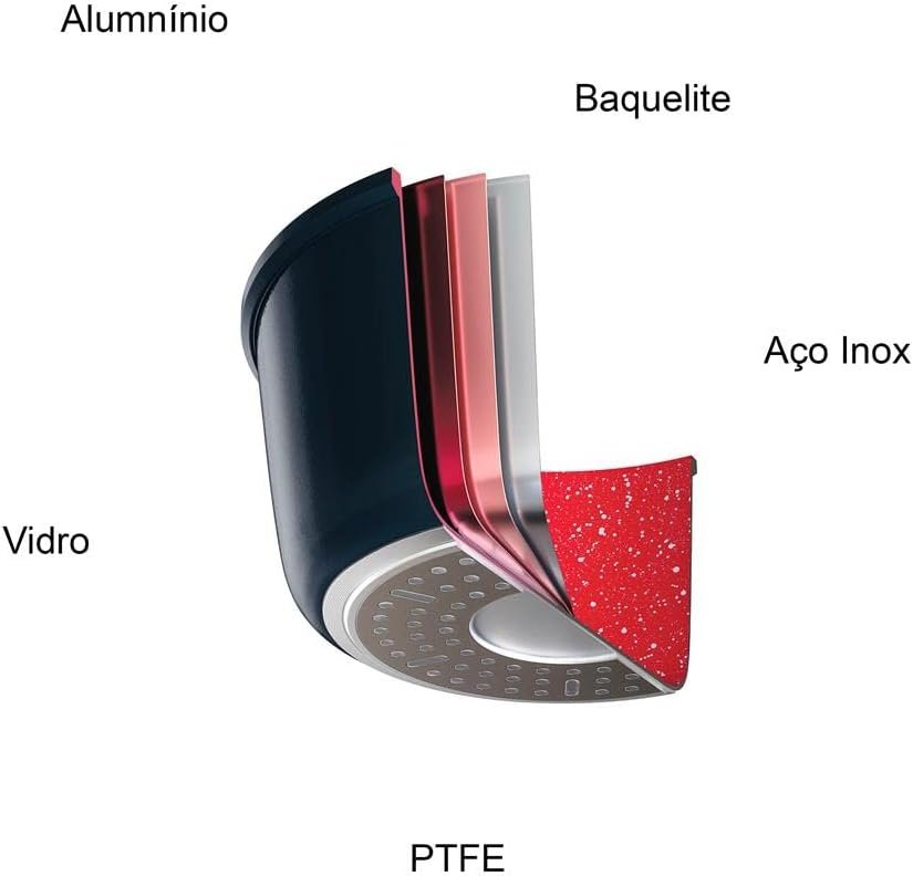 Revestimento antiaderente, os alimentos não grudam, possui 5 camadas: 1º antiaderente, 2º camada antidesgaste, 3º alumínio, distribui melhor o calor, 4º pintura resistente e 5º base inox, pode ser usada em fogões a gás, halogênio, cerâmico ou elétrico