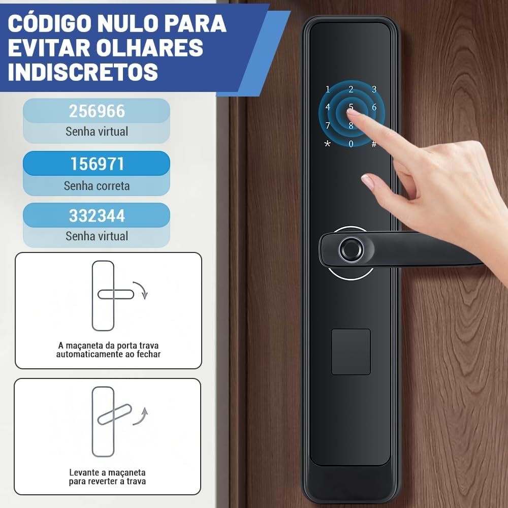 🏅〖 SENHA VIRTUAL 〗Esta fechadura digital possui uma função exclusiva de senha virtual anti-espionagem, que permite inserir códigos aleatórios antes e depois da senha correta, desde que a senha correta esteja contida no meio. Isso impede que outras pessoas vejam a senha, protegendo a segurança da sua casa de todas as formas.