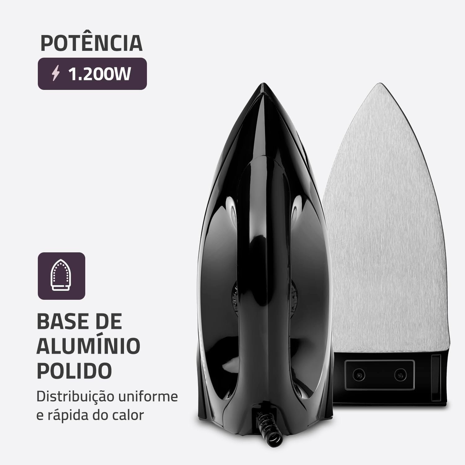 BASE DE ALUMÍNIO POLIDO: A base de alumínio desliza suavemente em todos os tecidos e garante distribuição uniforme e rápida do calor.