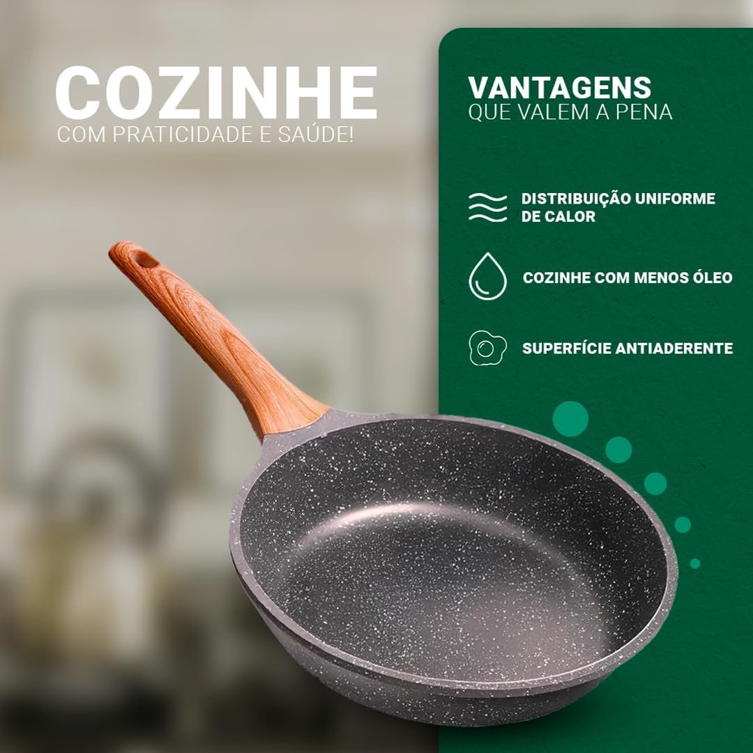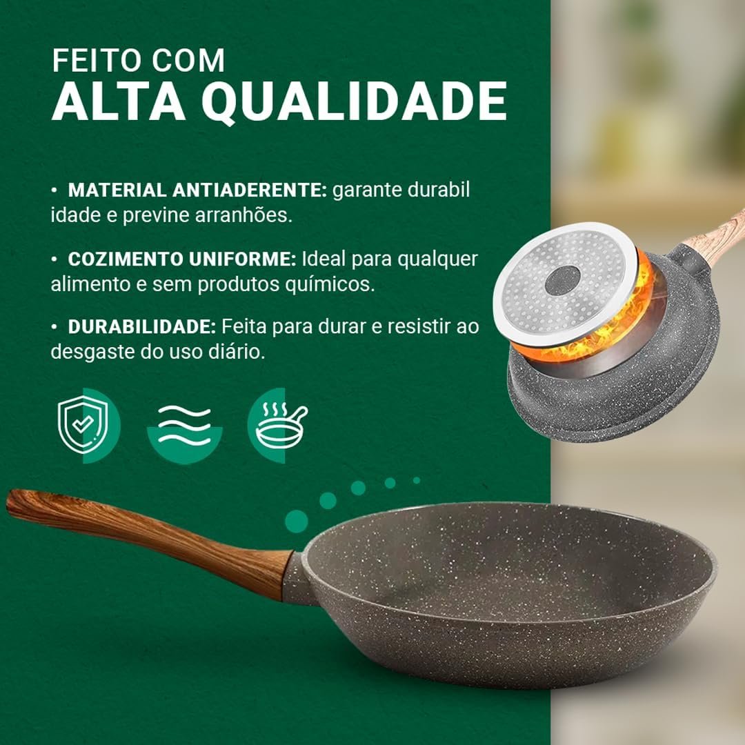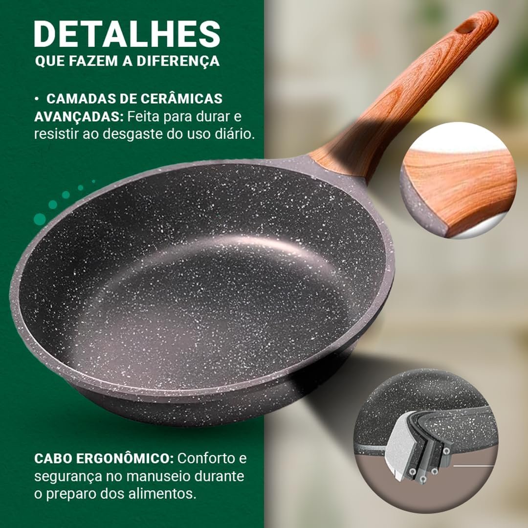Frigideira Antiaderente de Cerâmica Grande – Cozinhar e Fritar Saudável sem Óleo, Cabo de Madeira Ergonômico, Alta Durabilidade, Para Fogão a Gás, Elétrico e Indução
