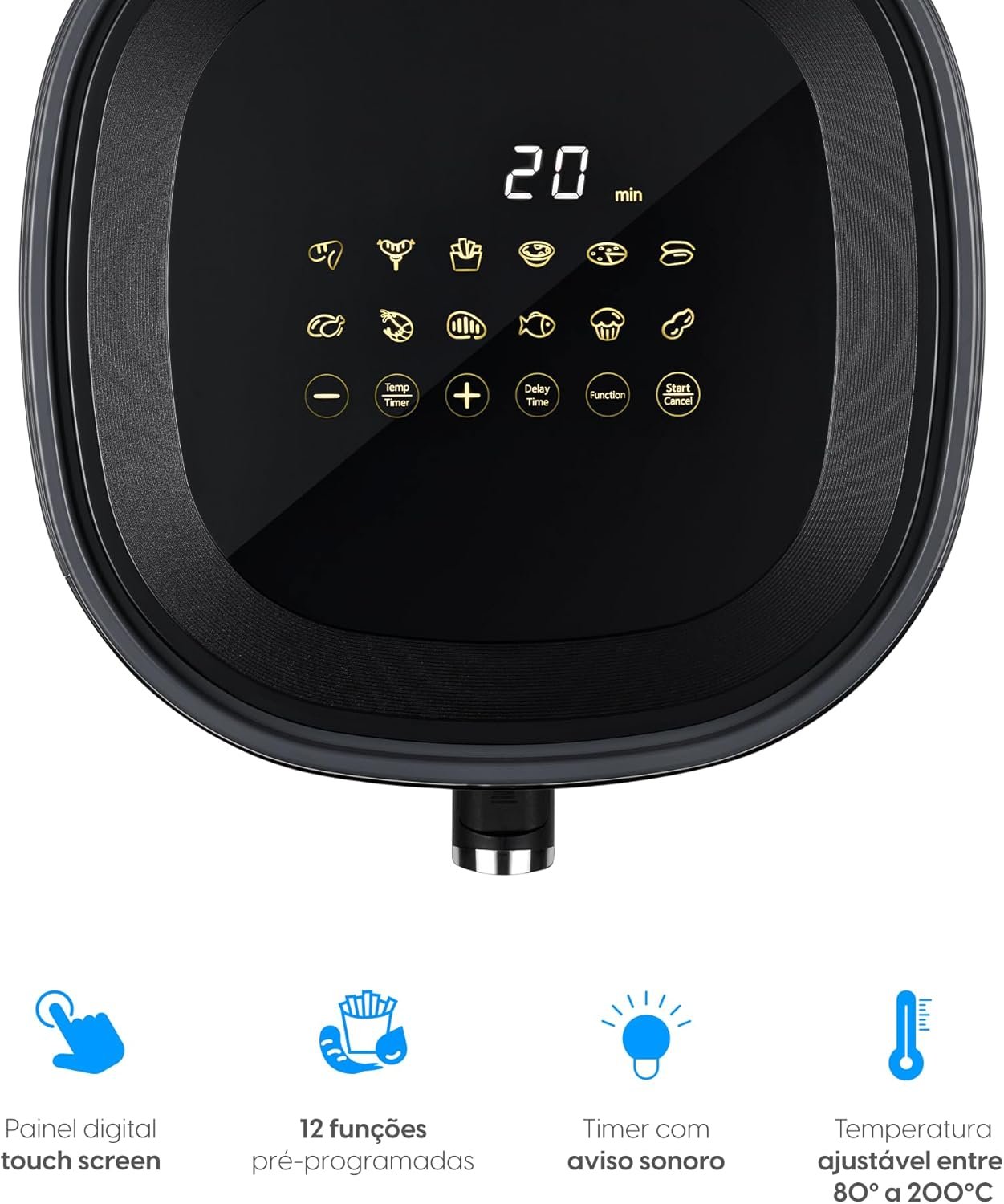 Eleve sua experiência culinária com a Visio Fry, uma fritadeira que combina design sofisticado e resultados incríveis. Com o visor transparente, você pode acompanhar o preparo dos alimentos sem abrir o cesto, mantendo o calor e a praticidade. O painel digital touch screen possui 12 funções pré-programadas para facilitar sua rotina na cozinha. Com capacidade de 5 litros, a Visio Fry é ideal para preparar refeições em grande quantidade para toda a família. Com potência de 1.700W, ela acelera o tempo de preparo, permitindo que você desfrute de refeições deliciosas em menos tempo. O cesto removível facilita a limpeza e pode ser lavado diretamente na lava-louças, poupando seu tempo e esforço. Experimente a inovação da tecnologia Black Resist, que proporciona uma proteção antiaderente superior e facilita a limpeza e a manutenção diária. A tecnologia Air Circuit 360°C garante uma circulação de ar quente em espiral no interior, assando os alimentos de forma uniforme e saudável, além de economizar energia. Com o cesto quadrado, você pode preparar porções maiores sem ocupar muito espaço na bancada. Desfrute de uma culinária mais saudável, reduzindo a gordura em 80% nas suas receitas favoritas. O timer de 60 minutos, com aviso sonoro, permite que você selecione o tempo de preparo com facilidade, e a temperatura ajustável de 80º a 200°C se adequa a diferentes tipos de alimentos. Além disso, a Visio Fry possui proteção contra superaquecimento, oferecendo tranquilidade e segurança durante o cozimento dos alimentos.