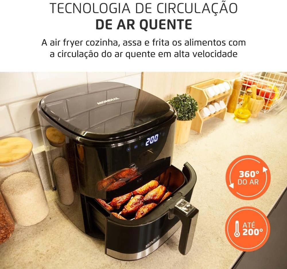 A Air Fryer Grand Family Digital Visor Mondial une praticidade e inovação em um único aparelho. Seu visor frontal e iluminação interna permitem acompanhar todas as etapas do preparo com a cuba fechada. Ela possui um painel digital touch que oferece controle preciso de tempo e temperatura, além de um design moderno e elegante. Com capacidade de 5 litros, acomoda os alimentos perfeitamente e garante a distribuição uniforme do ar quente. A potência de 2.000W proporciona eficiência e agilidade na cozinha. Descubra todas as funcionalidades da AF-50-DV da Mondial: