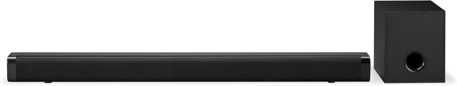 Barra de som sem fio de 81 cm + subwoofer sem fio proporciona tons médios claros e graves mais profundos e cheios. Som estéreo de 2.1 canais para áudio rico e dimensional.