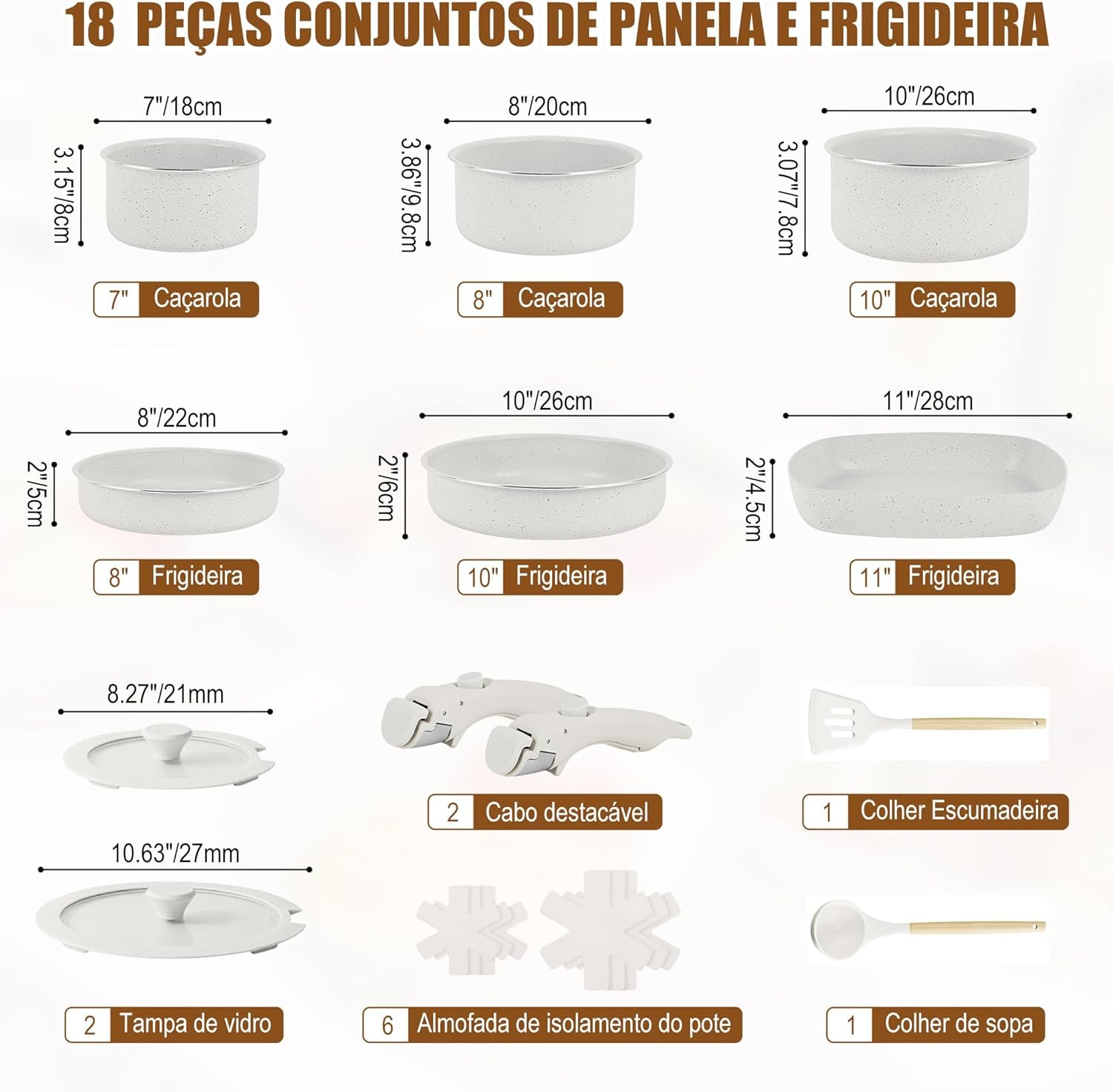 ✔️【18 Pcse de Embalagens】7″ Cacarola,8″ Cacarola,10″ Cacarola,7″ Frigideira,8″ Frigideira,10″ Frigideira,1 *Colher de sopa,1 *Colher Escumadeira,2 *Tampa de vidro,2 *Cabo destacavel,6 *Almofada de isolamento do pote.