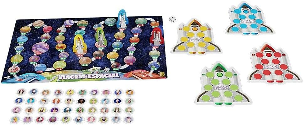Embarque nessa aventura espacial com os amigos! O jogo Viagem Espacial faz com que as crianças aprendam e pratiquem operações de soma e subtração de uma forma muito divertida! Nessa viagem, a cada parada nos planetas, sobem ou descem passageiros, dependendo do sinal naquele ponto de parada e dos números sorteados no dado. O vencedor será aquele que chegar com mais passageiros a bordo ao ponto final do trajeto. Boa viagem!