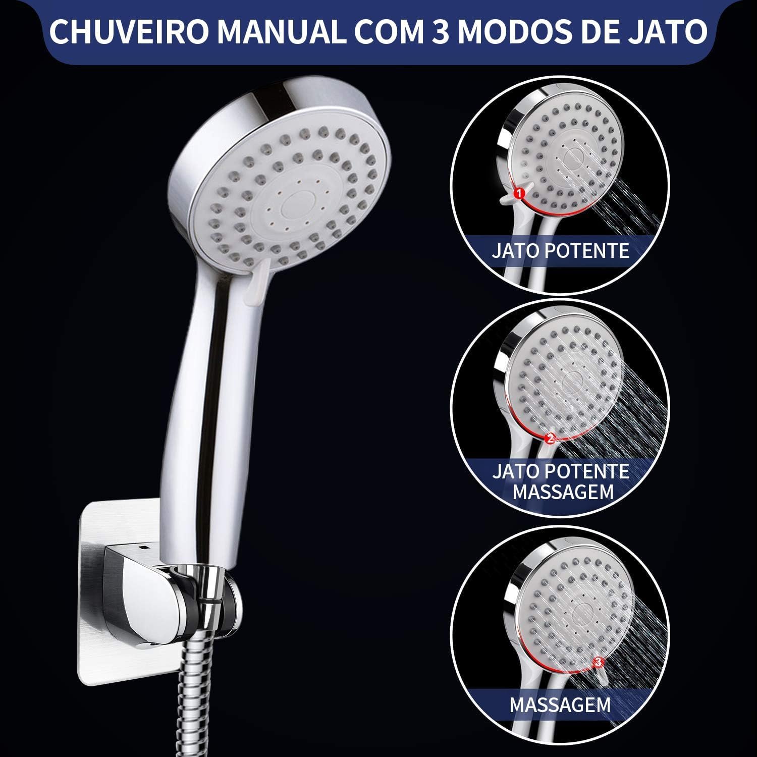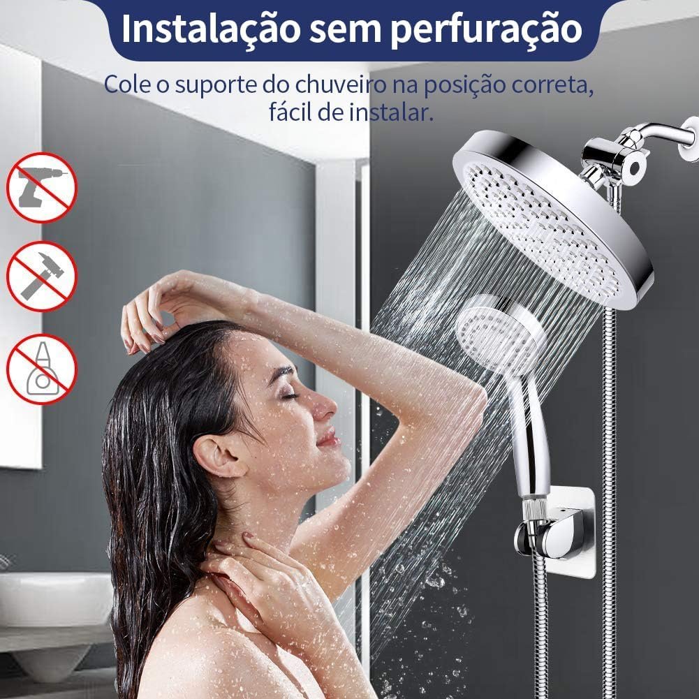 Kit Chuveiro Redondo Cromado de Alta Pressão com Ducha Manual Smart Removível, Filtro de Água, Instalação sem Furação, Mangueira Antivazamento 152cm